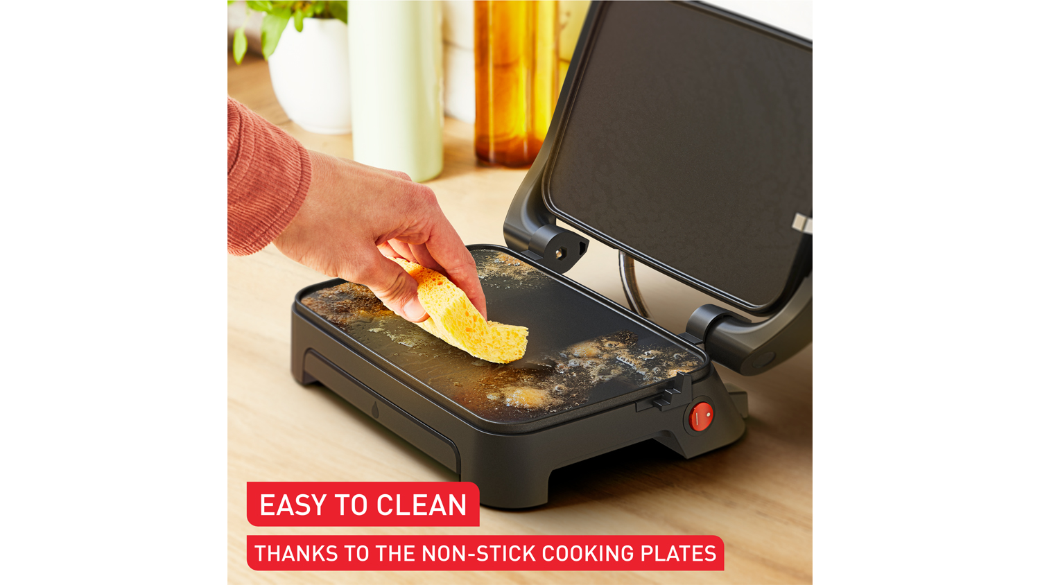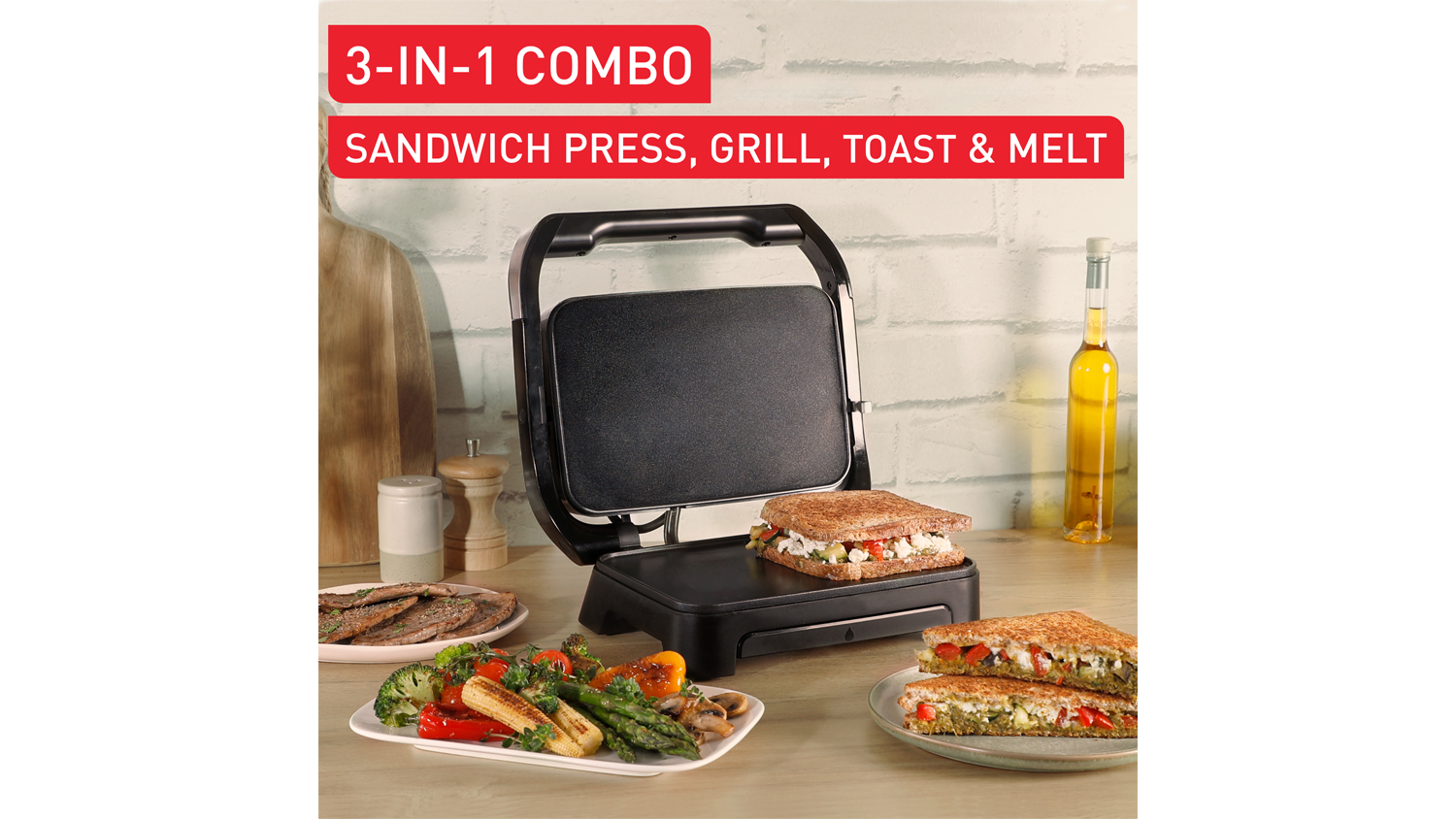 Prepare delicious sandwiches, grilled snacks, and melted treats with the Tefal Inicio Compact 2 Slice Sandwich Press. Its innovative 3-in-1 design combines toasting, grilling, and melting in one compact appliance, while 1000W power ensures fast cooking. Cleanup is stress-free with non-stick plates and a removable, dishwasher-safe juice tray.