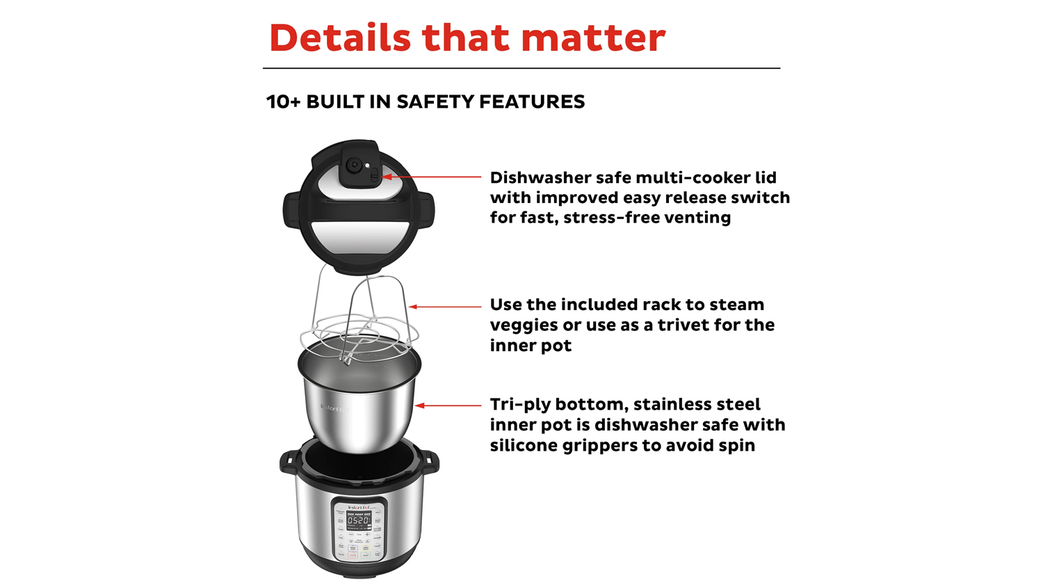 • Safe to Use: For your peace of mind, the Duo Plus MultiCooker has different safety features, including overheat protection and a safe locking lid. It also includes an extra sealing ring and a stainless steel steamer rack with handles.