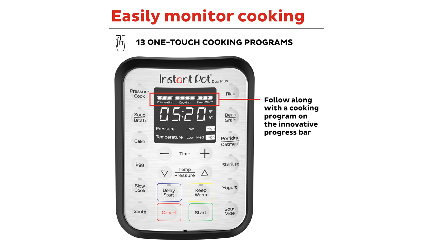 • Feature-packed Machine: Cooking meals for the whole family has never been easier! This Duo Plus cooking device boasts a digital black-on-white display for simple operations. It also integrates 13 customisable smart programs for quick one-touch cooking. Plus, it has individual controls for start button, cooking time, and temperature/pressure.