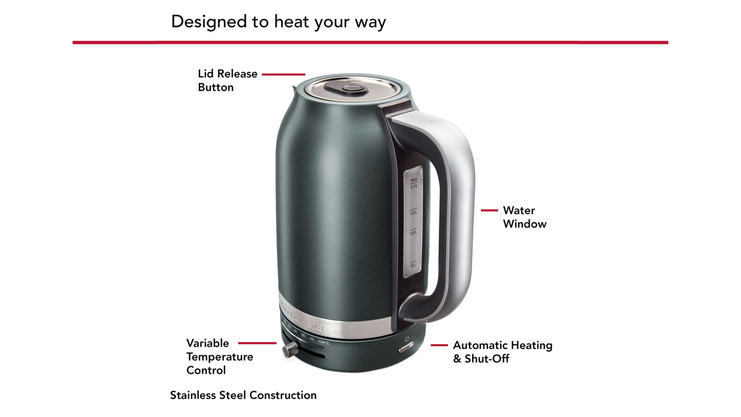 Enjoy perfectly warm drinks in no time with the help of the KitchenAid 1.7L Variable Temperature Kettle. Quiet and efficient, this appliance incorporates the cutting-edge Automatic Heating Technology that optimally boils water to an ideal temperature. It also packs various convenient features like a removable limescale filter, adjustable temperature, premium spout, and 360° base.