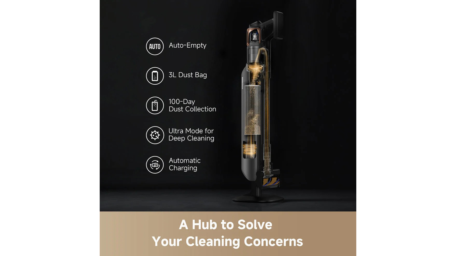 | Control Functions | Display battery level in %; particulate matter indicator (in Auto mode) showing dust load; suction-level switch (Eco/Auto/Turbo) |