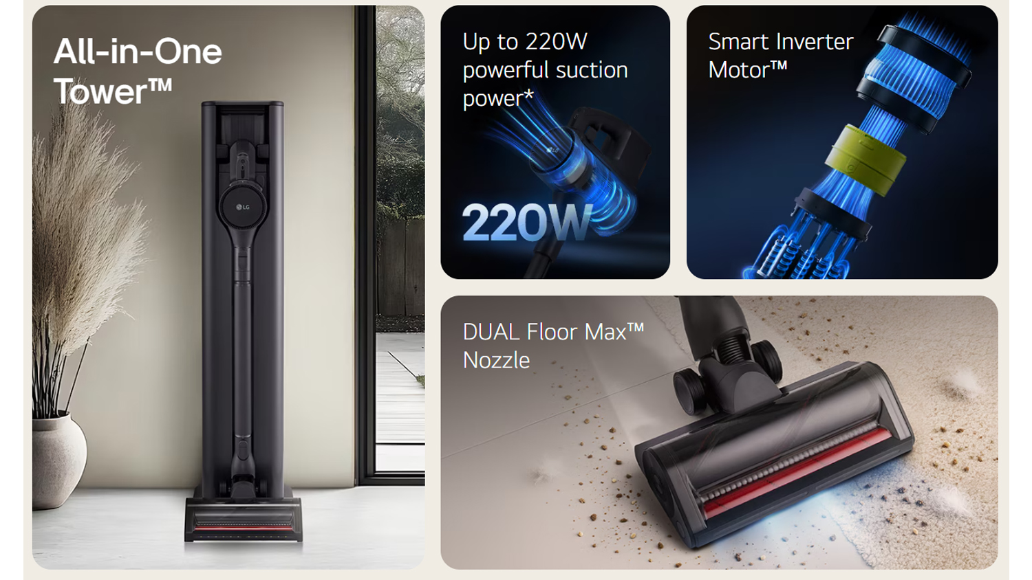 Make light work of home maintenance with the LG CordZero A9L Tower Auto Emptying Handstick Vacuum Cleaner. Powerful and reliable, this appliance delivers up to 220W suction to effectively handle various dirt, dust, and mess around your home. It also perfectly combines Smart Inverter Motor and Dual Turbo Cyclones to ensure smooth performance. Plus, it utilises a DUAL Floor Max Nozzle for easy switching between hard floors and carpet.