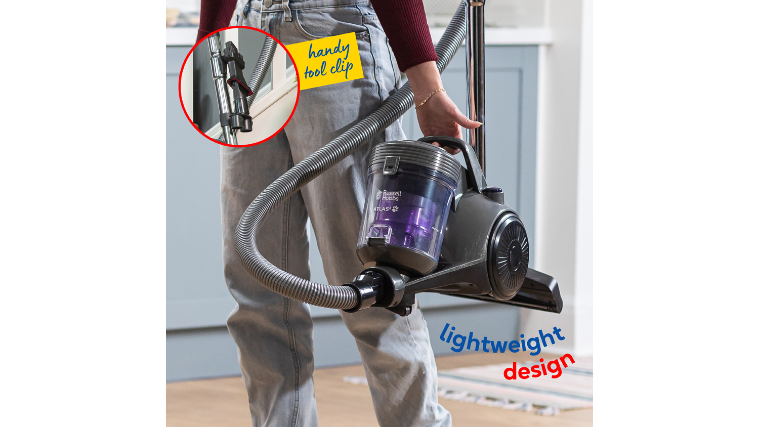 Tackle pet hair and dust in one go with the Russell Hobbs Atlas2 Pets Cyclonic Cylinder Vacuum. Its 700W motor and dedicated turbo pet tool deliver consistent, high-powered suction to lift stubborn fur from carpets and upholstery. Featuring Triple Dust-Lock Filtration, the system traps dust and allergens, ensuring a healthier home environment. Plus, its washable filters and a lift-and-lock bin mean emptying and maintenance are quick, easy, and mess-free.