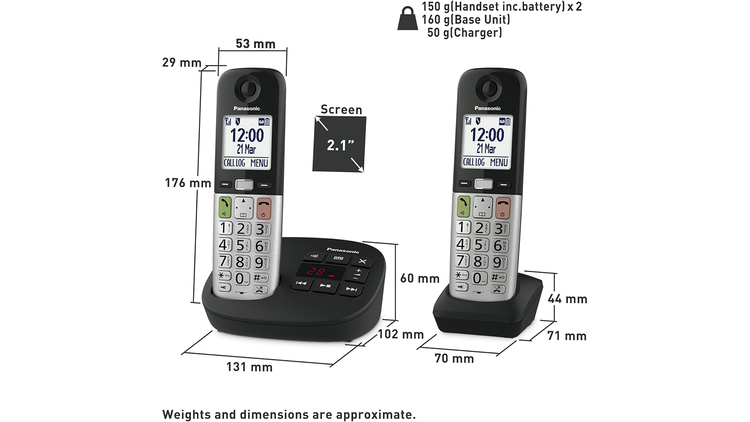 | Product Weight | Base Unit: 0.16 kg, Cordless Handset: 0.15 kg, Charger: 0.05 kg |