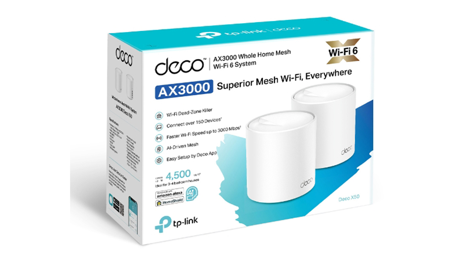Expand your connectivity and enjoy blazing-fast speeds with this 2-pack TP-Link Deco X50 AX3000 Whole Home Mesh Wi-Fi 6 System. Each unit incorporates a dual-band Wi-Fi connectivity with speeds of up to 3.0 Gbps, Wi-Fi 6, four streams, three gigabit wired ports, and TP-Link HomeShield network protection to accommodate all of your Wi-Fi needs. This pack of 2 Deco X50 can also cover up to 420 sqm of area or a 3 to 4 bedroom house, making it a perfect connectivity solution for small to medium homes or businesses.