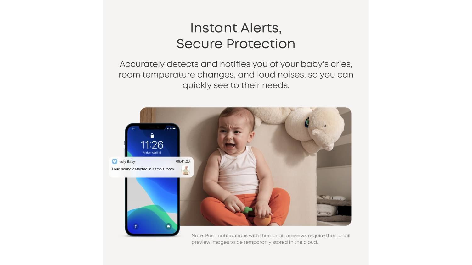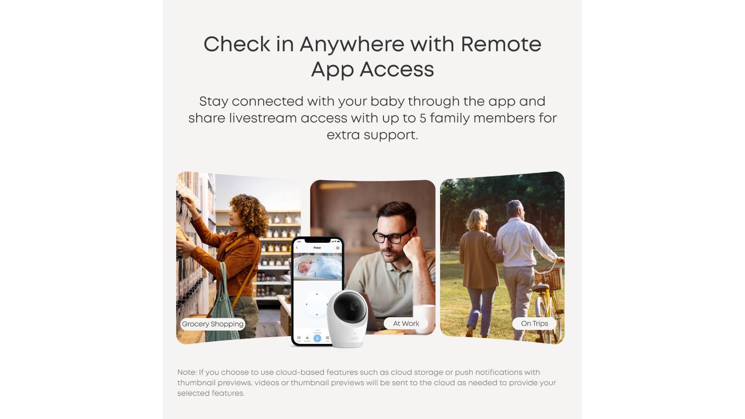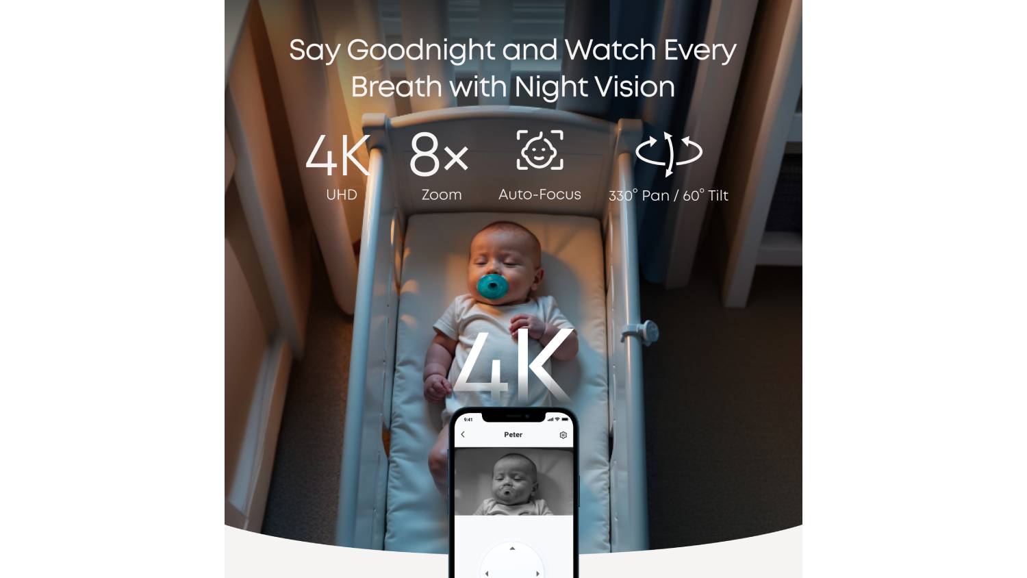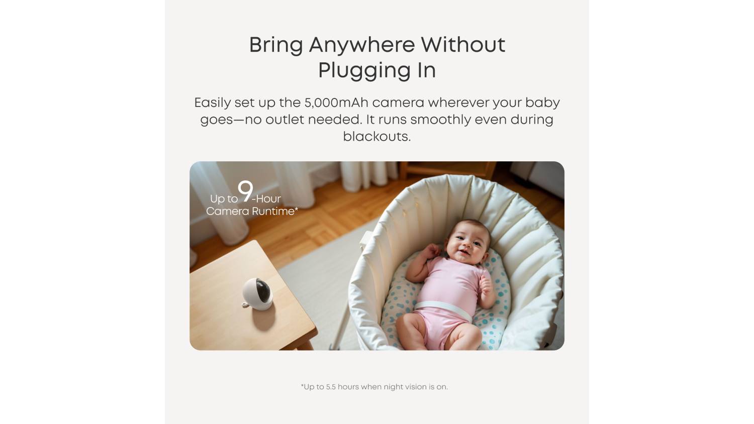 Double the love, double the view. Effortlessly activate the split-screen function on your Eufy Baby Monitor by pairing it with the Eufy E21 Add-On Camera. Featuring 4K UHD resolution and various movement functions, this device lets you keep a close eye on two kids or get a wider view of your little one’s nursery. Additionally, this unit showcases a palm-sized structure and is powered by a 5,000mAh battery, so you can utilise it at home or during travels.