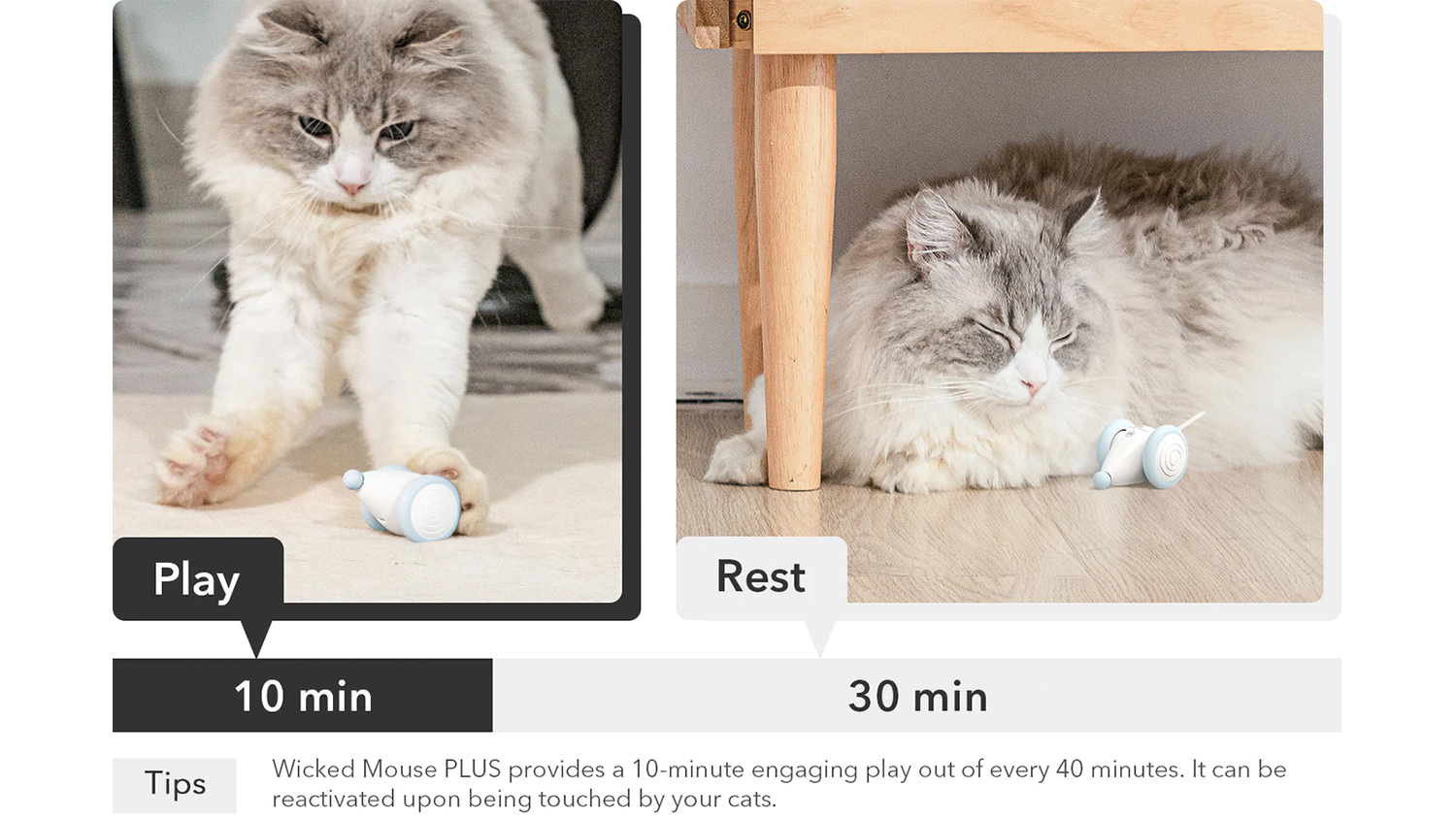 *Wicked Mouse PLUS provides a 10-minute engaging play out of every 40 minutes. It can be reactivated upon being touched by your cats.