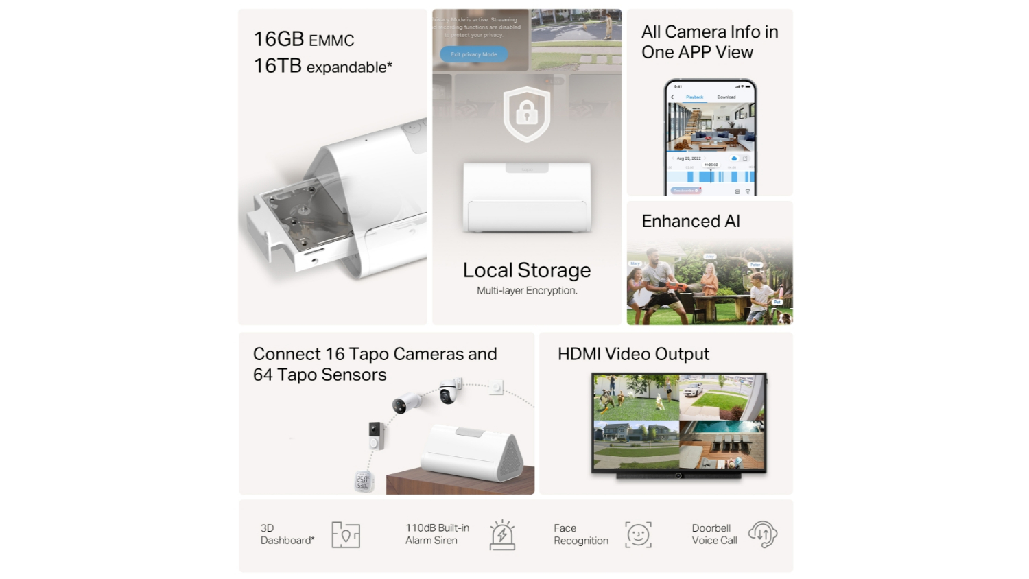 Seamlessly manage your entire security system with the TP-Link Tapo H500 Smart HomeBase. Designed for modern living, this device reliably connects up to 16 Tapo cameras and 64 Tapo Sub-G sensors for a more unified network. It also boasts 16GB of storage to readily keep your captured footage. Plus, it packs more handy features like 110dB alarm, HDMI ports, and Tapo app support.
