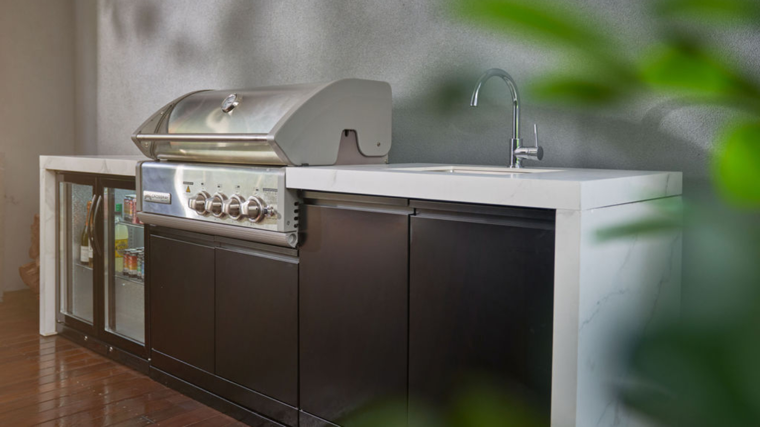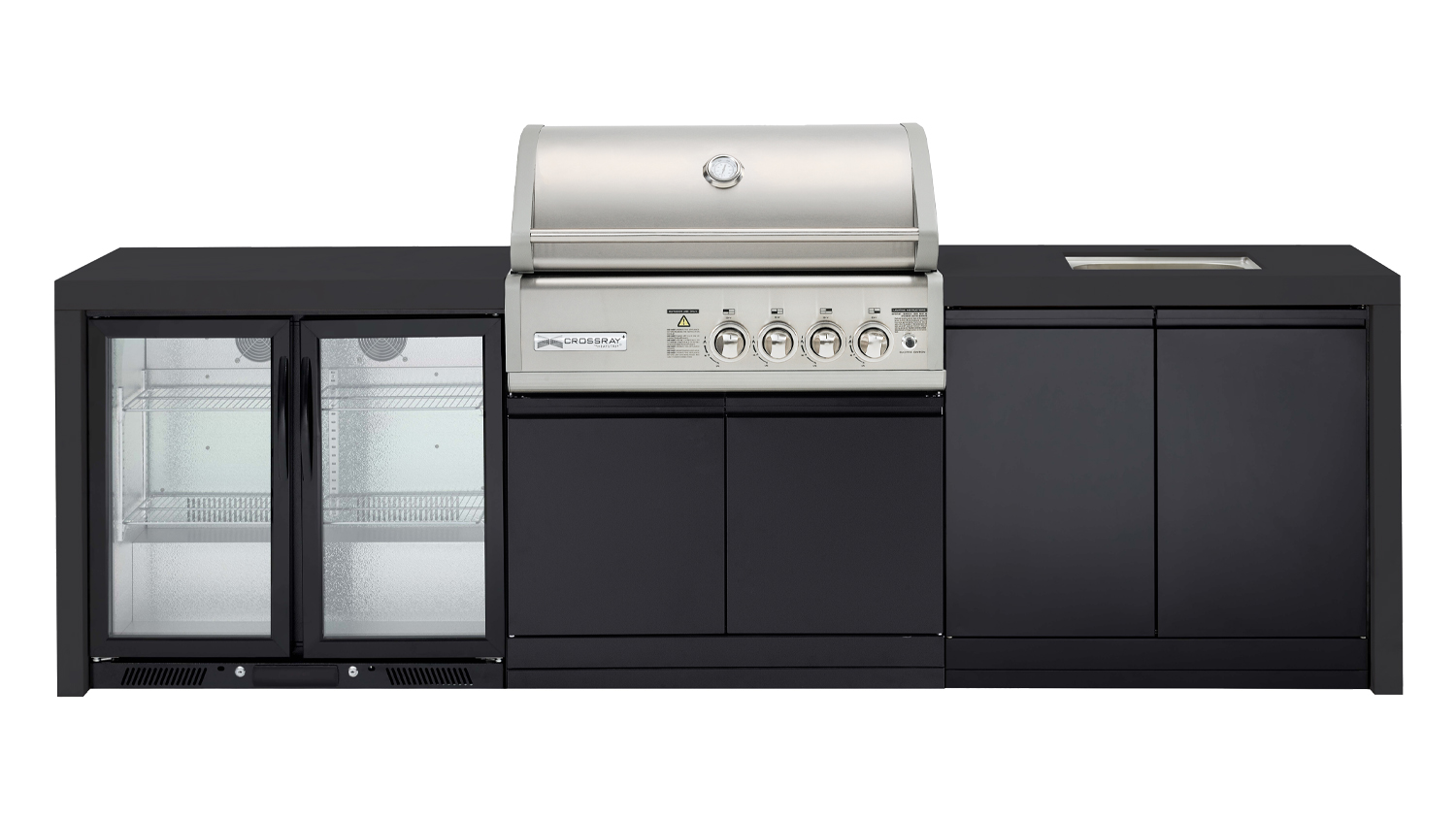 **Please note: Price is for one Crossray 4 Burner Gas BBQ Outdoor Kitchen with Double Fridge and Sink only. Tap, accessories and other items shown are not included.