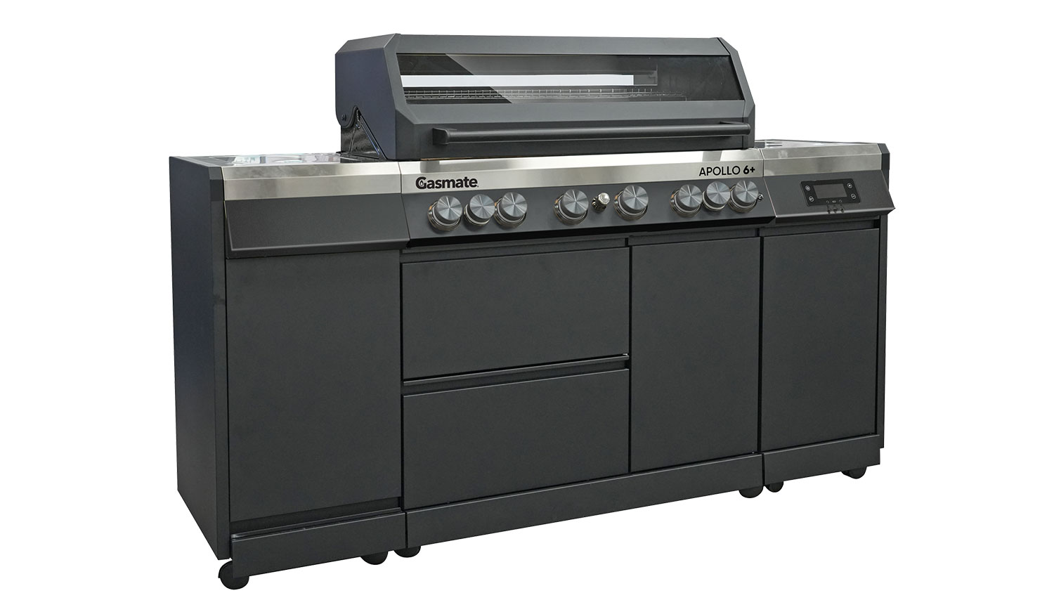 The Gasmate Apollo 6 Burner Outdoor BBQ Kitchen puts everything you need to cook, prep, and serve right at your fingertips. Powered by six stainless steel tube burners with a total of 90.6MJ/h output, this unit lets you have the capacity and heat to turn every meal into a masterpiece. It also includes cast-iron hot plates, grill plates, a stainless steel warming rack, and Bluetooth/Wi-Fi-enabled precision digital control for a truly professional cooking experience.