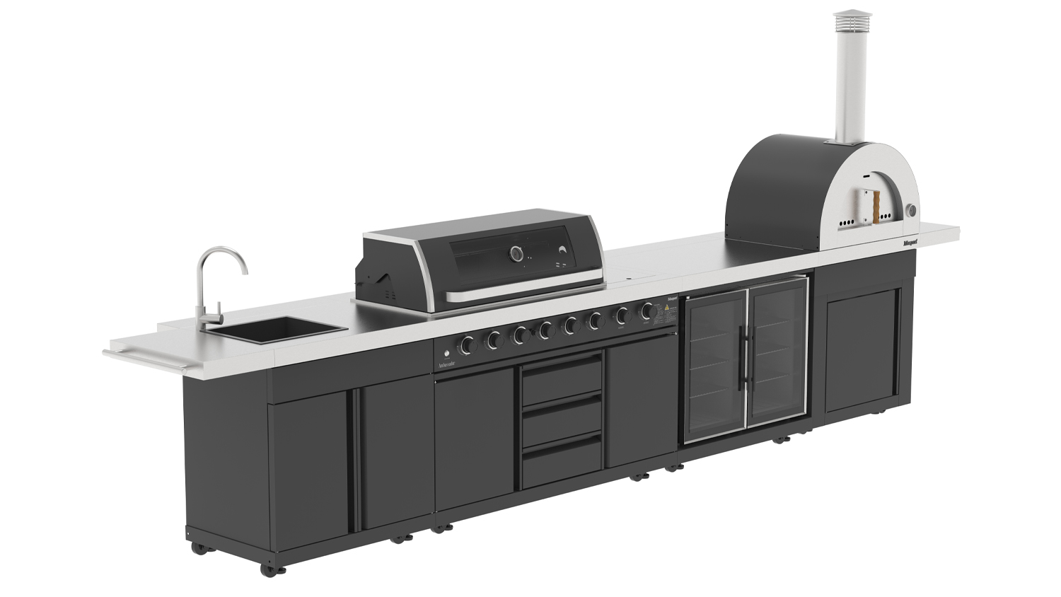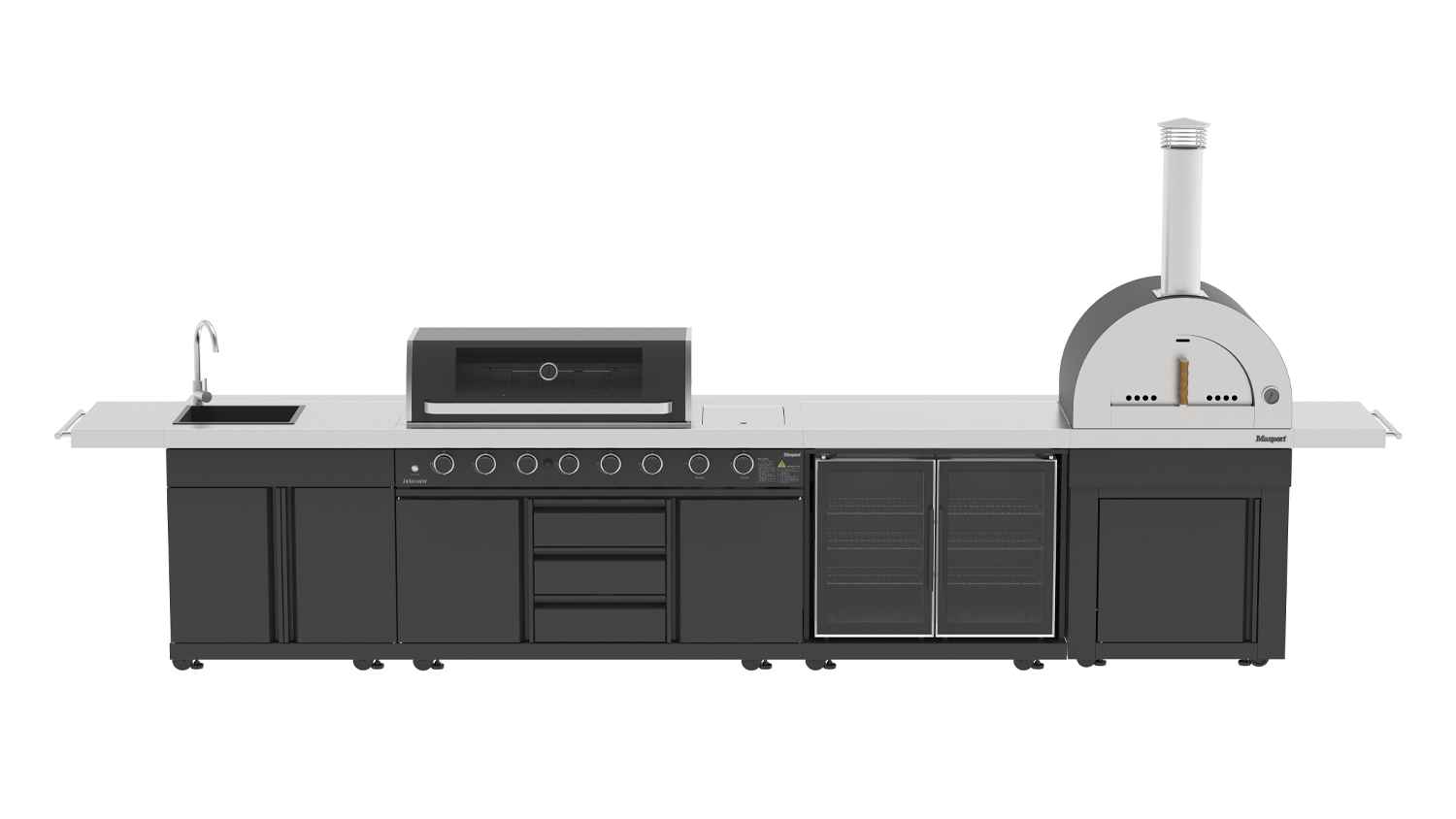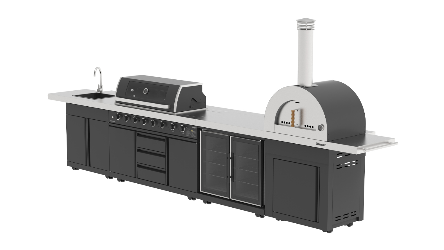 Ignite your passion for outdoor cooking with the Masport Ambassador 6 Burner 4 Piece Outdoor Kitchen with Woodfire Pizza Oven! This unit boasts six burners that offer endless culinary possibilities, while the woodfire pizza oven brings a delightful twist to your backyard parties. It also comes with a fridge and a sink module, so you can effortlessly prepare and serve delicious meals while keeping your ingredients fresh and accessible.