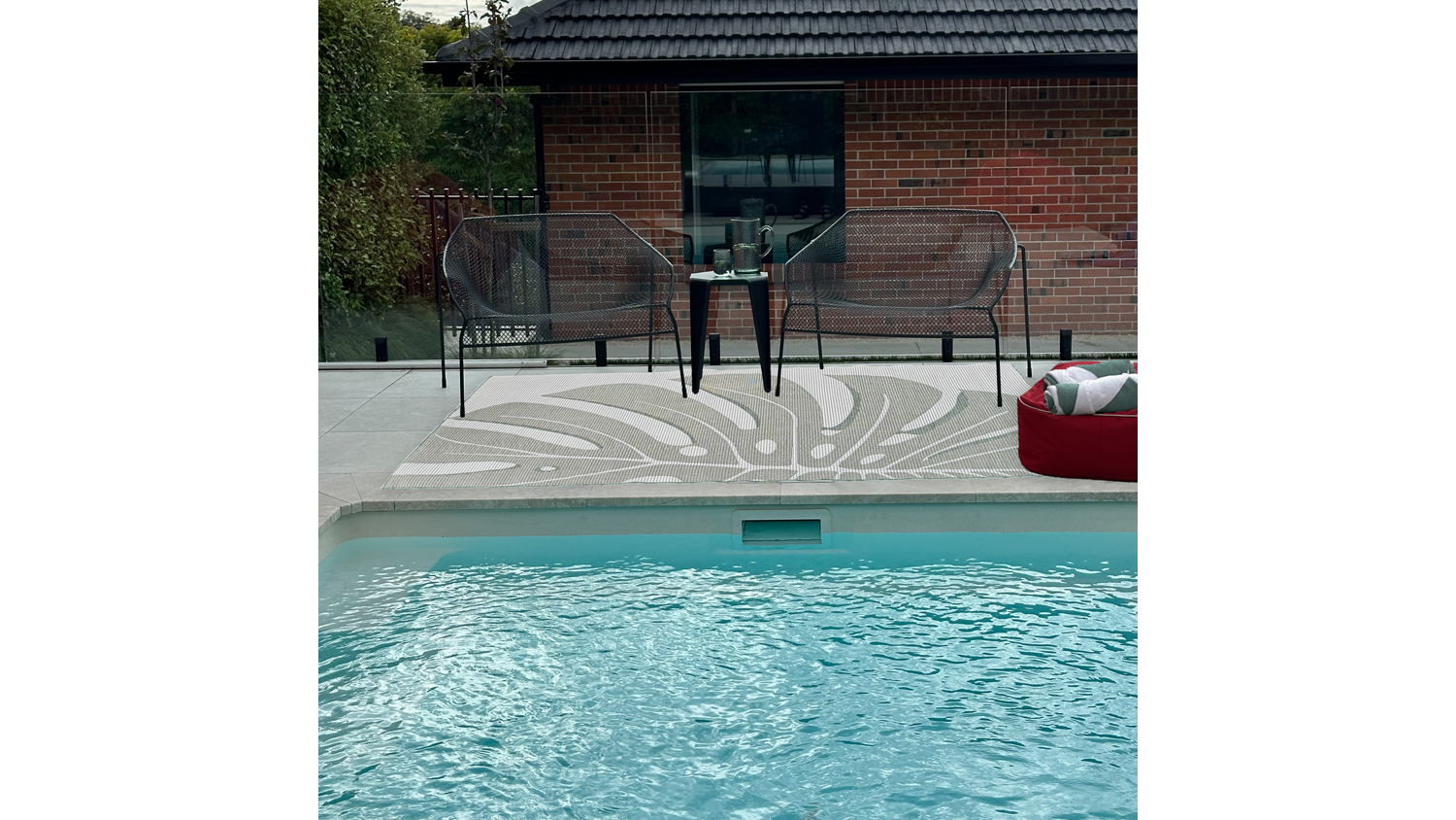 **Care instructions: Rinse thoroughly with a garden hose, and allow to dry completely before vacuuming. Vacuum or shake as necessary. Clean spills immediately by blotting with absorbent paper or a clean cloth. Do not pull loose ends; either trim with scissors. When the outdoor entertaining season is over, we recommend storing your dry, rolled rug in a covered area to avoid fading. Do not use harsh chemicals as they may damage the rug.