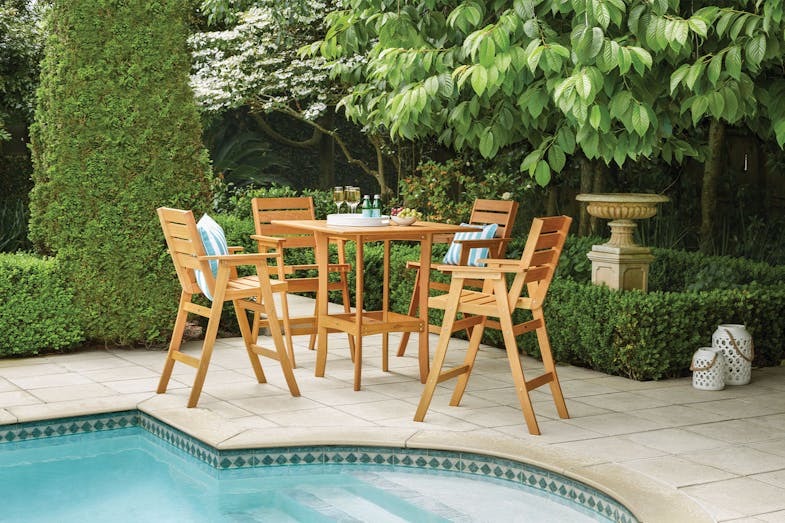 Enjoy a classic laid back New Zealand Summer with the Madeira 5 Piece Outdoor Bar Setting. The solid wide slats on the seat and back of the chair ensure comfort and durability. The suite is made from FSC Certified Timber, stainless steel fittings and features an umbrella hole, perfect for those hot days. Style this piece with the outdoor décor range available at Harvey Norman.
