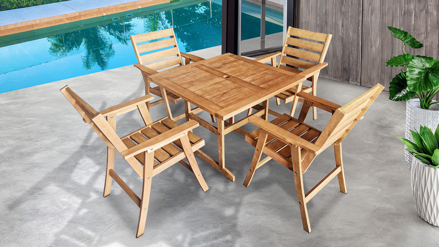 Enjoy the ultimate al fresco experience with the Madeira 5 Piece Outdoor Dining Setting! A wonderful addition to your poolside, this furniture set showcases a classic wooden design that brings a summery vibe to your space. It also comes with an umbrella hole, so you can bring shade and stay protected from the scorching sun*.