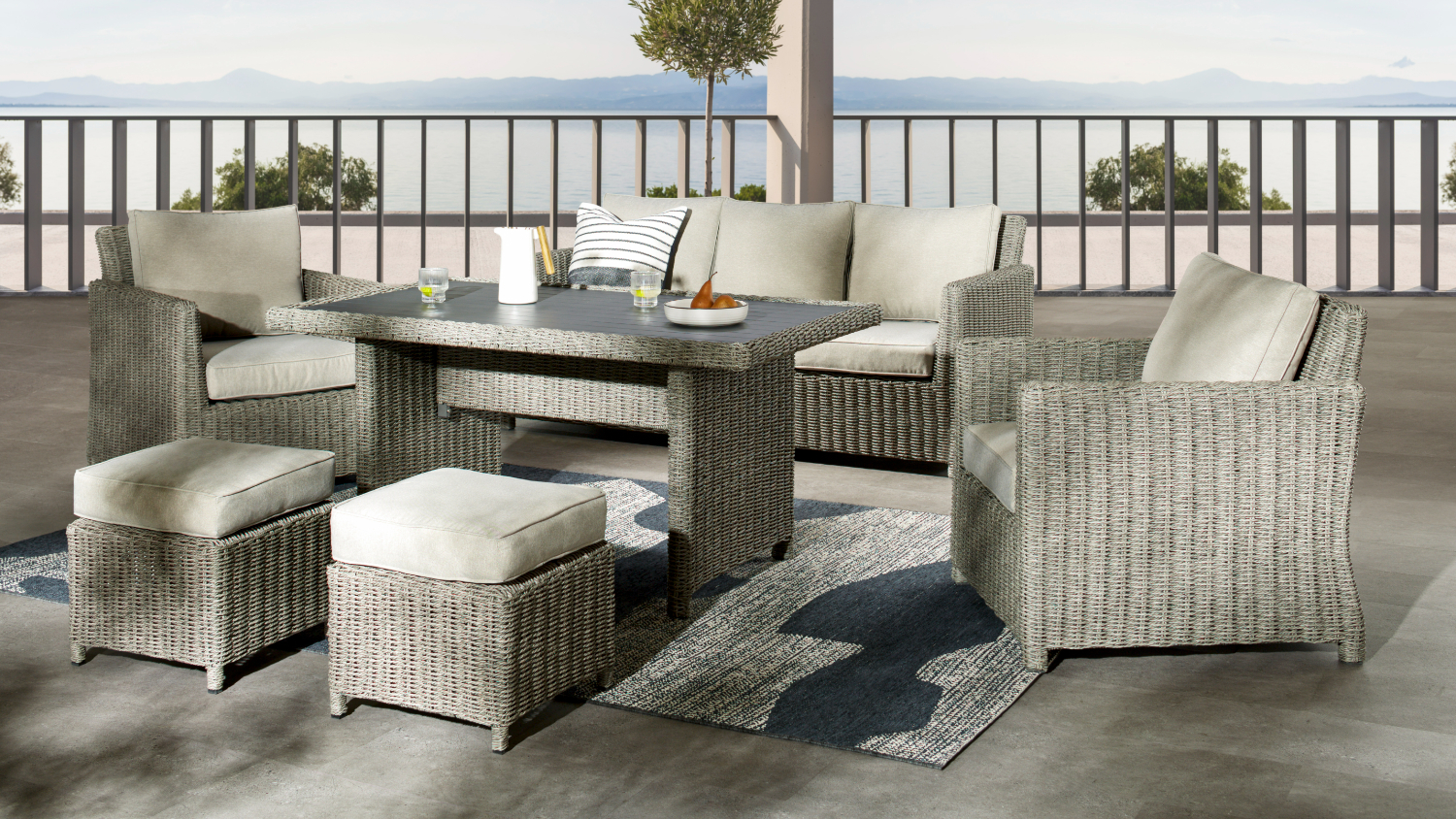 Enjoy cosy gatherings with your family and friends using the Mercedes 6 Piece Outdoor Dining Suite! A perfect addition to your garden or patio, this furniture set consists of a rectangular dining table, a 3-seater sofa, two armchairs and two ottomans. It also features a hand-woven resin wicker design that enhances your space with a timeless, inviting feel.