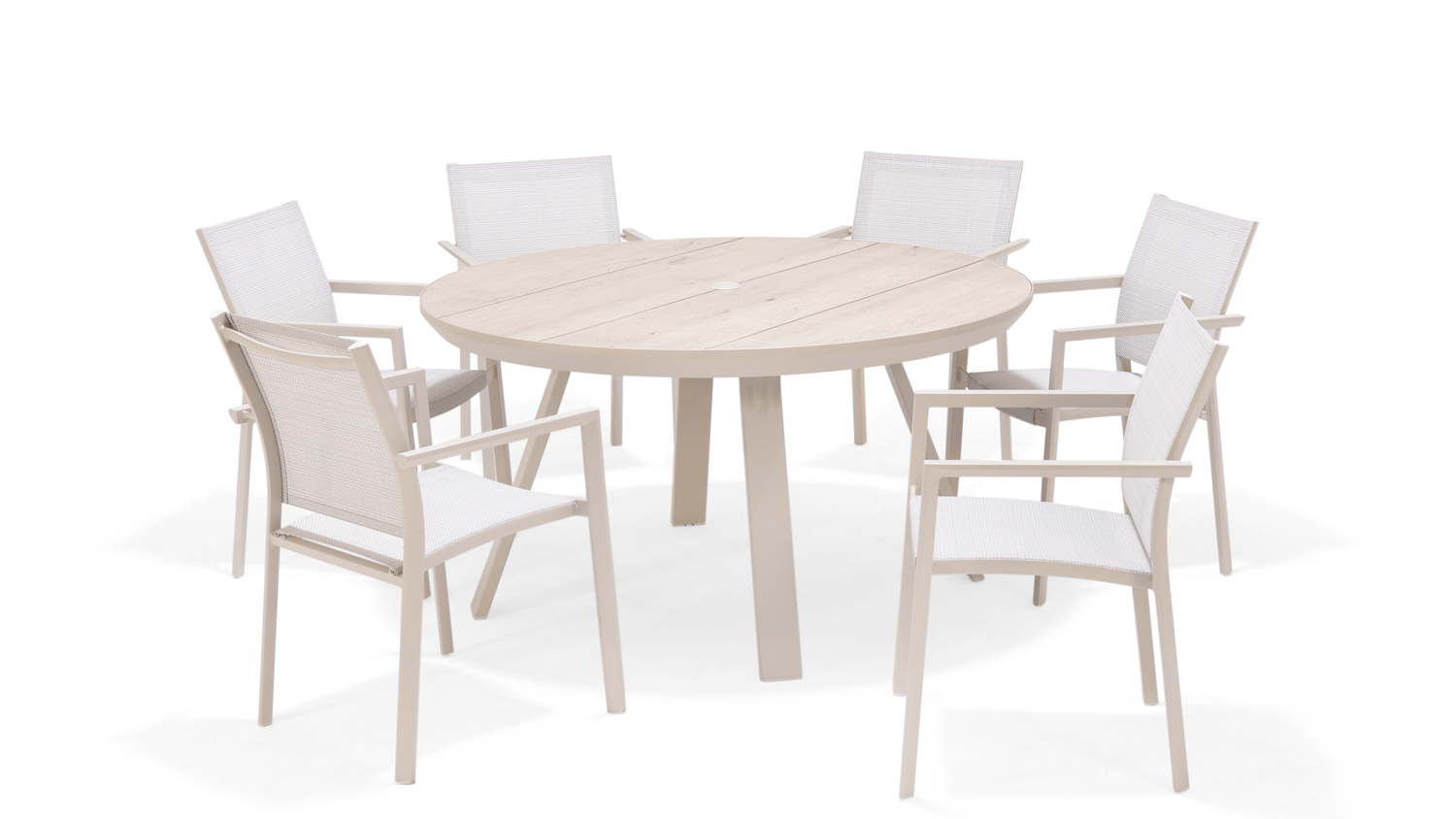 Add a touch of contemporary elegance to your home exterior with the Urbanite 7 Piece Round Outdoor Dining Suite. This stylish set features an aluminium table with a duraboard table top and six comfortable chairs with Textaline—perfect for alfresco dining. It also showcases a refined hue that offers a seamless blend of modern aesthetics and outdoor-inspired tones.