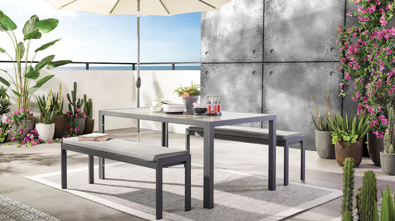 Enjoy a cosy outdoor dining space perfect for intimate conversations and alfresco meals, thanks to the Wardell 3 Piece Bench Outdoor Dining Setting. A wonderful addition to your patio or courtyard, this setting flaunts a contemporary finish that goes well into any space. It is also built with rust-resistant aluminium framing and a ceramic table top to stand up against most elements. Meanwhile, the two included benches provide comfortable seating for big groups, making it the perfect spot to host family and friends for memorable gatherings.