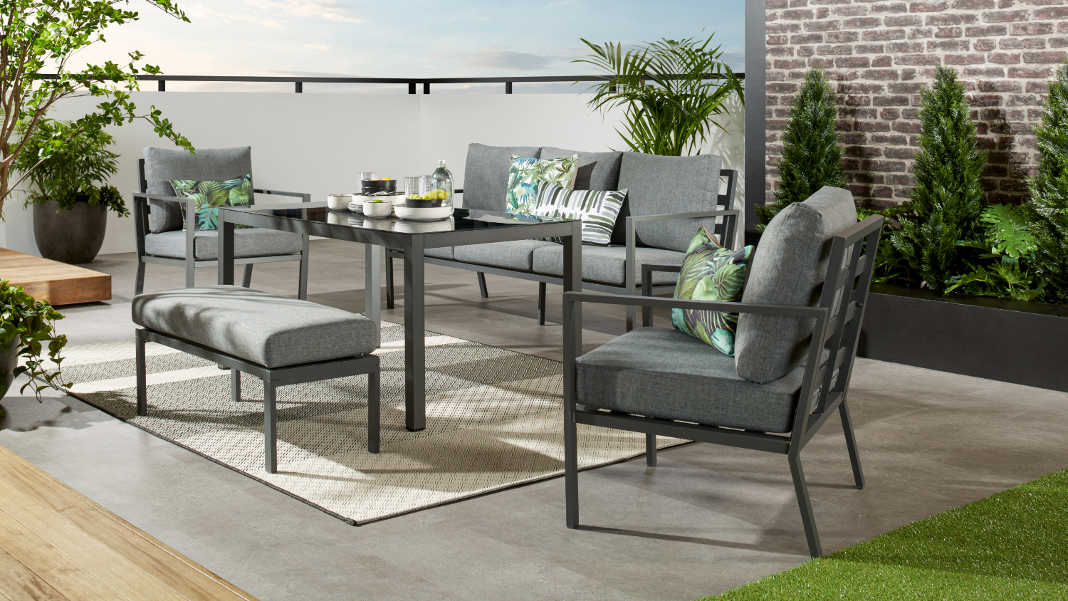 Enhance your Alfresco dining and relaxation experience with the Karter 5 Piece Outdoor Lounge and Dining Setting. Featuring plush, cushioned seating and a spacious dining table, this set offers both comfort and functionality. Its sturdy framing ensures durability, making it the perfect choice for any outdoor space.