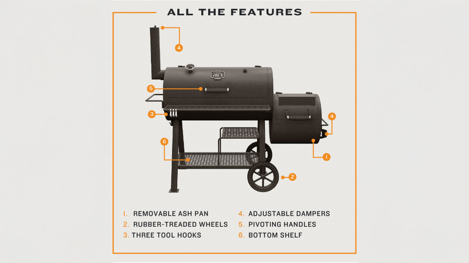 Built for the serious pitmaster, Oklahoma Joe's Highland Offset Smoker delivers legendary barbecue flavours right in your backyard. This heavy-duty rig features a large horizontal cooking chamber and a firebox on the side to accommodate various delicious dishes. It also integrates adjustable dampers and a smokestack, allowing you to regulate heat and smoke easily. Additionally, this unit packs in handy storage shelves, tool hooks, and a pair of wagon wheels to ensure you have everything you need for a smooth and satisfying cookout.