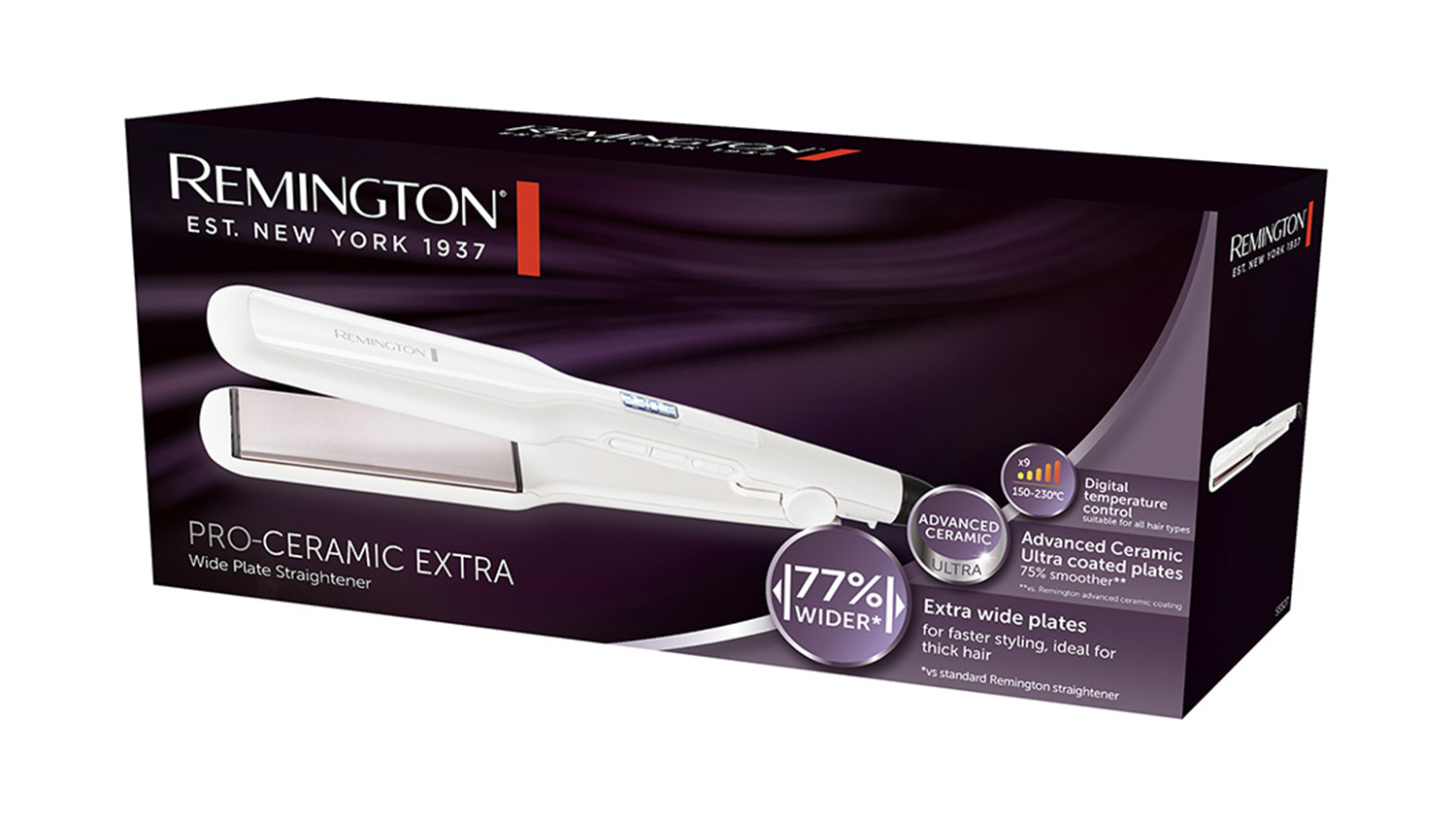 Style up your crowning glory with the Remington Pro-Ceramic Extra Wide Plate Hair Straightener! Boasting extra wide plates with advanced ceramic coating, this nifty hair tool lets enjoy bigger and smoother glides, as well as snag-free styling. Plus, with 9 temperature options, you can find the heat setting that works best for your hair type.
