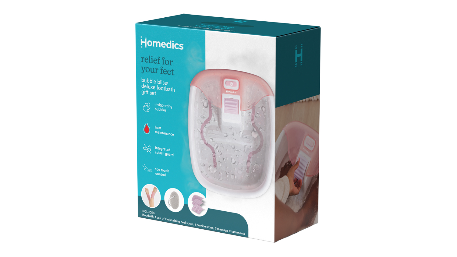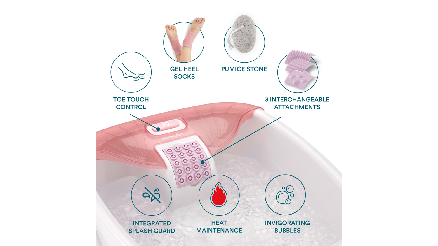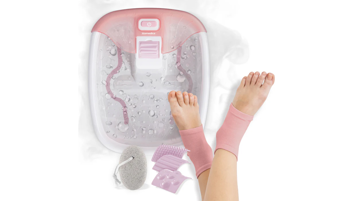 Step into the world of self-care with the Homedics Bubble Bliss Deluxe Foot Spa, the ultimate all-in-one retreat for tired, aching feet. This unit lets you experience the soothing sensation of a gentle bubble massage paired with heat maintenance technology, ensuring your soak stays perfectly warm while it melts away the day's stress. It also offers convenient relaxation with hands-free toe-touch controls and three interchangeable attachments designed to stimulate, exfoliate, and revive. Complete your pampering ritual with the included pumice stone and plush gel socks for professional-grade results that leave your soles feeling silky soft and rejuvenated.