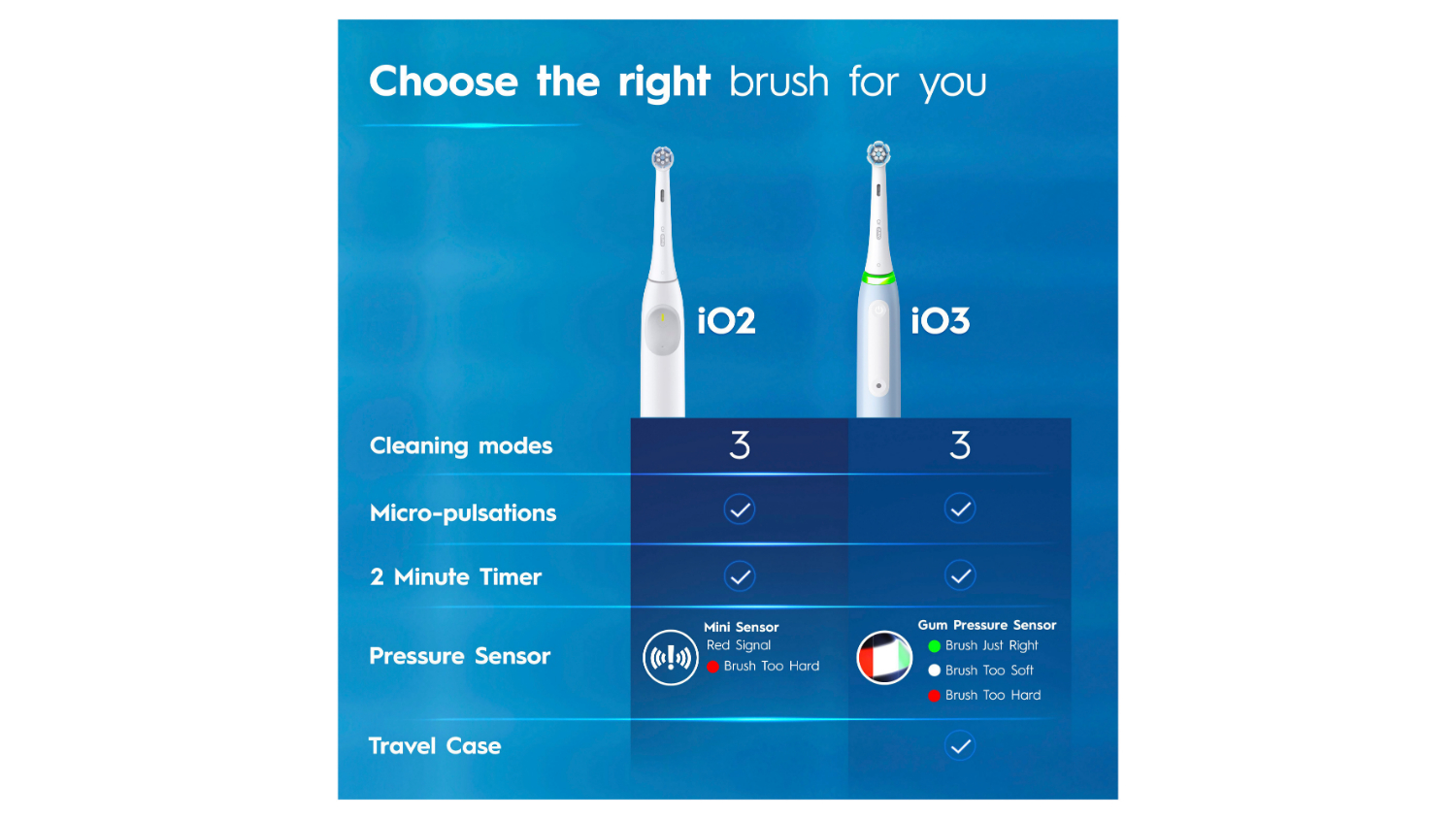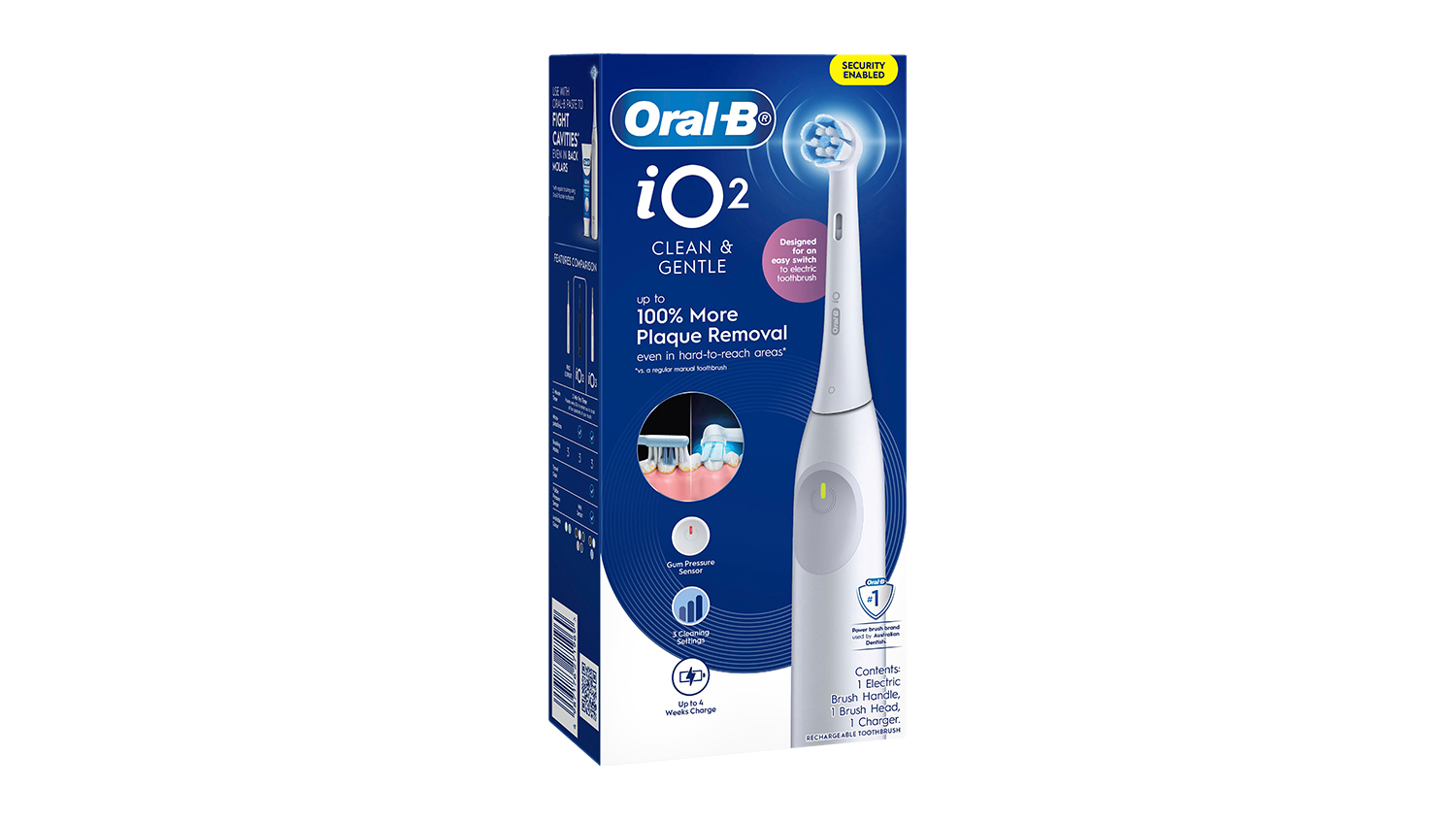 Upgrade your dental hygiene with the Oral-B iO2 Electrical Toothbrush. A great choice for your everyday oral care needs; this unit flaunts a round brush head with micro pulsating bristles that deliver superior plaque removal. It has three modes for Daily Clean, Sensitive, and Extra Sensitive to suit your different brushing needs, plus a gum pressure sensor to ensure an extra gentle clean.