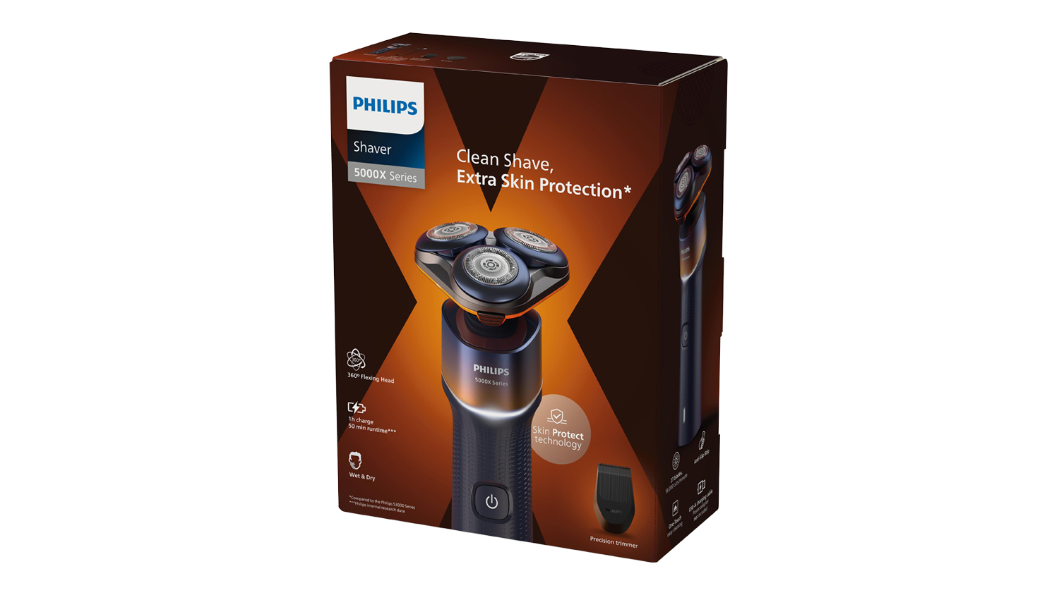 Transform your grooming routine and stay polished day after day, thanks to the Philips 5000X Series Wet & Dry Cordless Shaver. Delivering a close, smooth shave, this device combines 360° Flexing Heads, Skin Protect Technology, SkinGlide Protective Coating, and PowerCut Blades. It also comes with a precision trimmer attachment and is suitable for both wet and dry use. In addition, this unit offers a 50-minute run time on a single 1-hour charge.