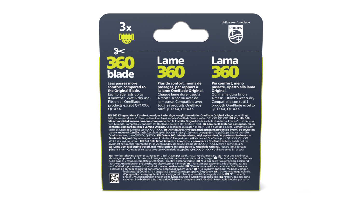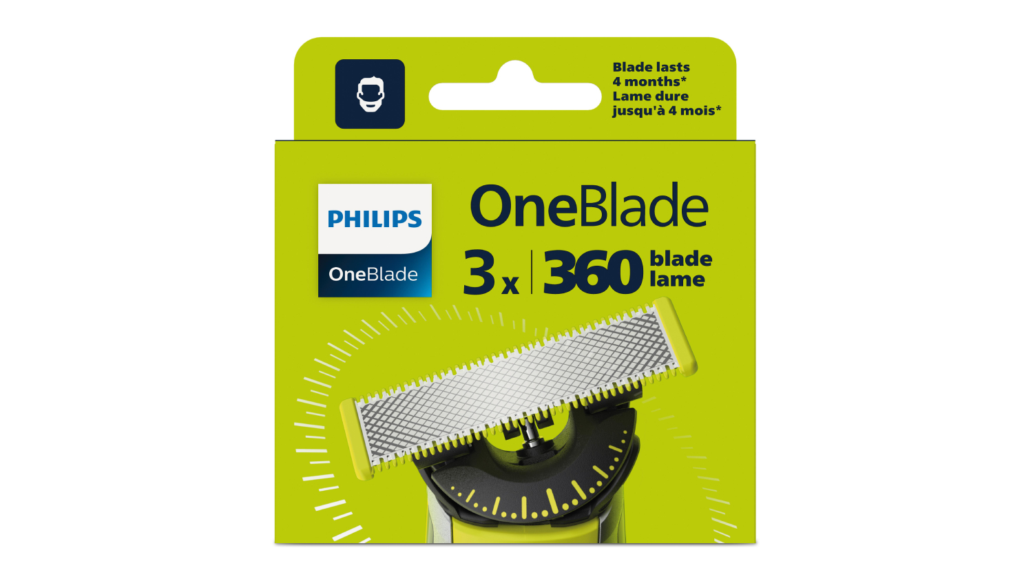 Precisely trim, polish, and shave facial hair using the Philips OneBlade 360 Replacement Blade 3 Pack. A great partner for your shaver, this pack includes three innovative 360 Blades that flex in any direction, seamlessly following the contours of your face. Each blade also boasts a waterproof design, so you can conveniently shave wet or dry, even in the shower.