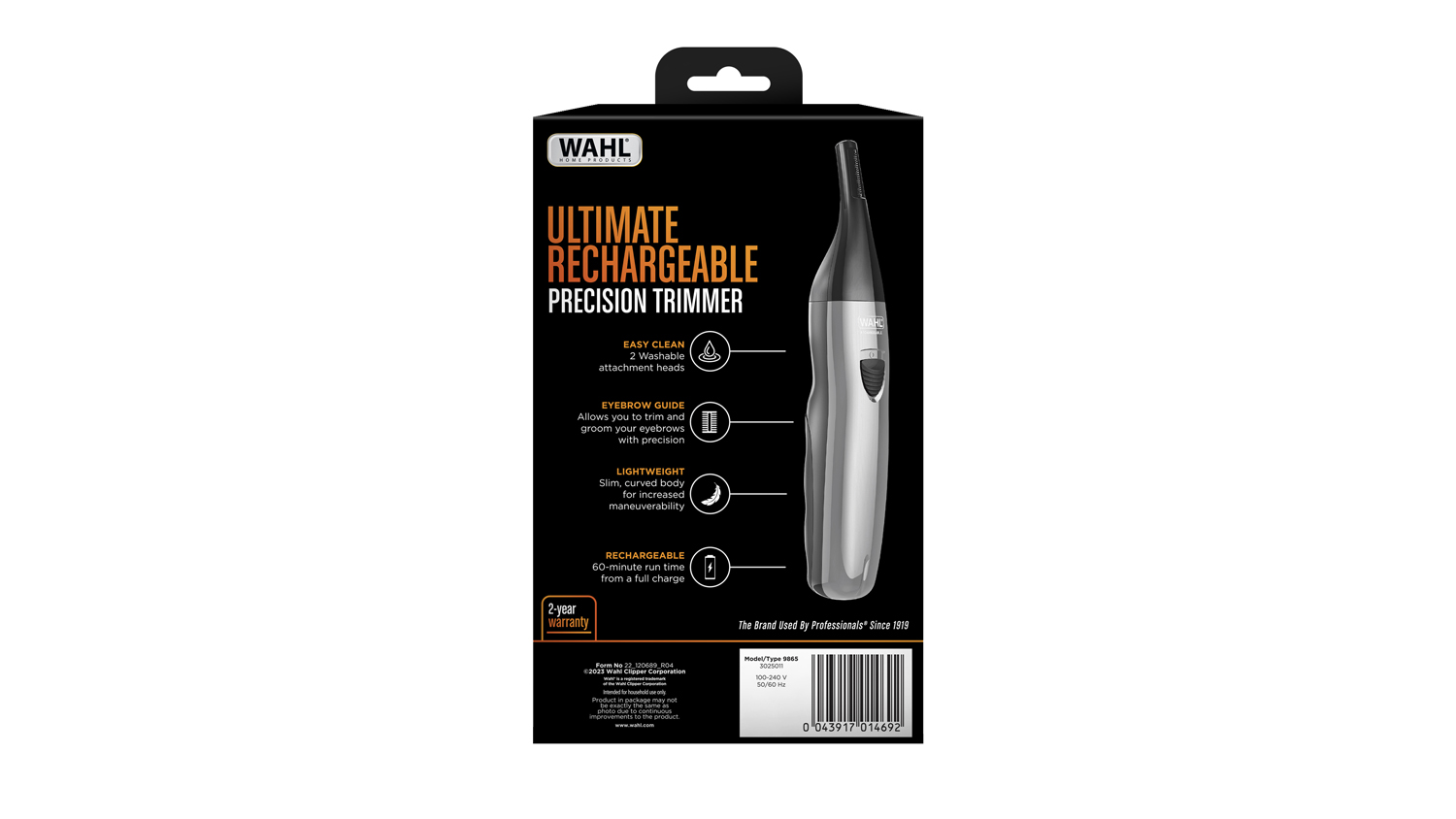 Meet the Wahl Ultimate Precision Cordless Trimmer, the ultimate solution for flawless, detailed grooming. This tool features both vertical and rotary head attachments, allowing you to maintain your ear, nose, and eyebrow hair with ease. It also provides up to 1 hour of cordless run time, giving you enough time to finish off your self-care routine in one go. Plus, this unit showcases a compact and travel-friendly design, making it suitable for both home and on-the-go use.