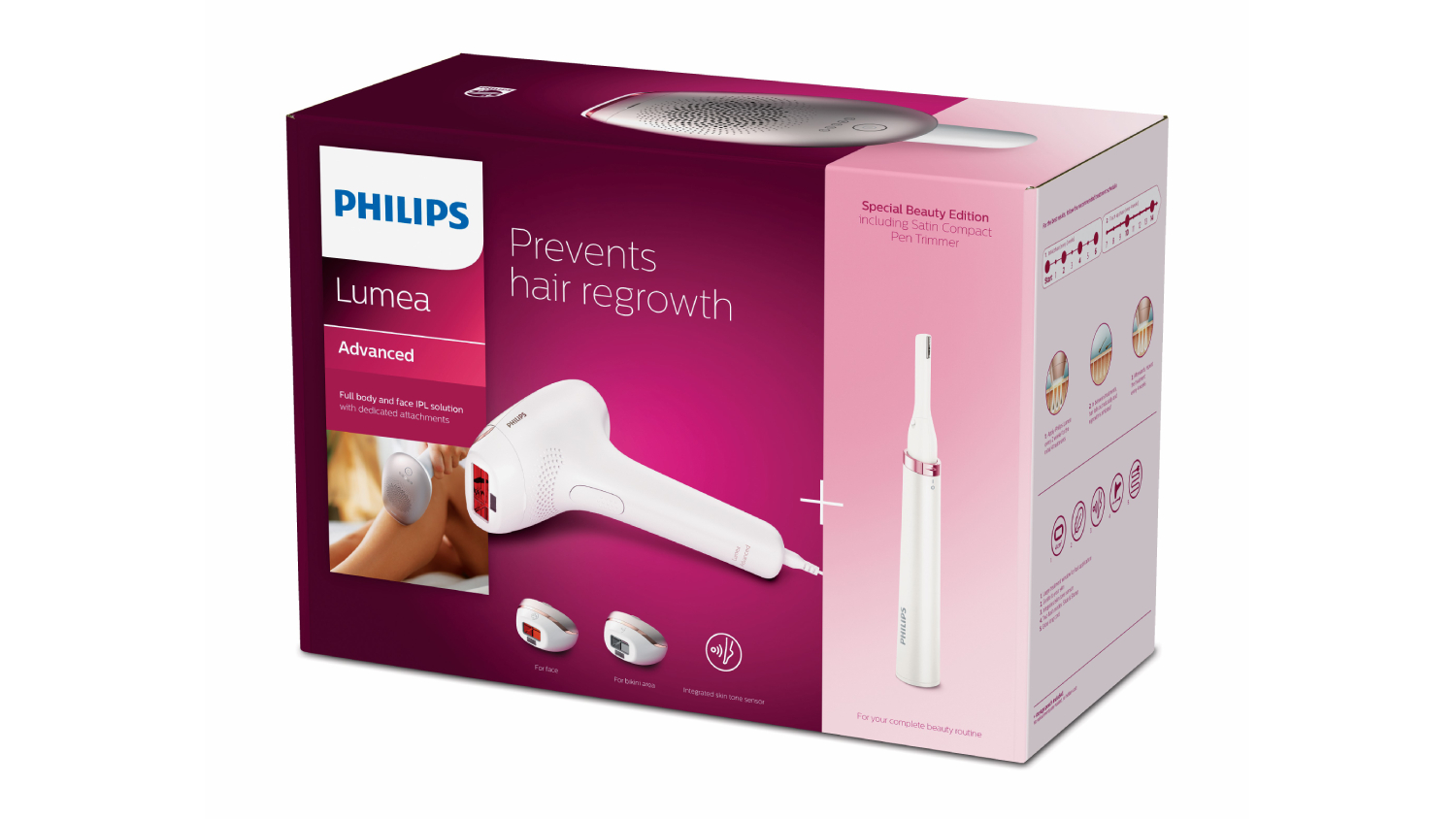 Achieve smooth and hair-free skin right from the comfort of your home using the Philips Lumea 7000 Series IPL Hair Removal Device. A must-have in your self-care routine, this device features IPL technology, 5 manual intensity settings, 3 attachments, and a satin compact pen trimmer. It also works on fair to medium brown (I-IV) skin and very white to black-coloured hairs for extra convenience.