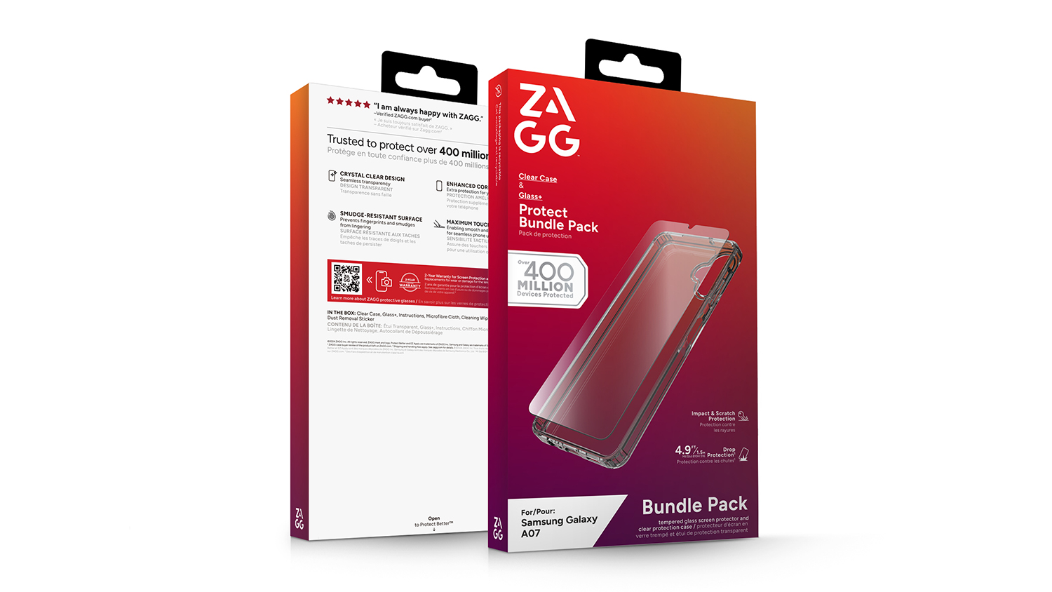 All-day clarity meets all-around durability in this Zagg Case and Screen Protector Bundle. A perfect companion for your Samsung Galaxy A07, this duo reliably safeguards your device against casual bumps, scratches, and impact. It also flaunts a clear design that highlights your phone’s beauty while keeping your display responsive. Plus, it offers up to 4.9ft drop protection to provide total peace of mind.
