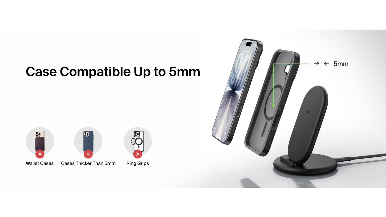 - Broad Compatibility: The Belkin BoostCharge Wireless Charging Stand is suitable for use with various Qi and MagSafe-enabled devices such as the Google Pixel 10, Google Pixel 10 Pro, Google Pixel 10 Pro Fold, Google Pixel 10 Pro XL, Google Pixel 9a, iPhone 17, iPhone 17 Pro, iPhone 17 Pro Max, iPhone Air, iPhone 16, iPhone 16 Plus, iPhone 16 Pro, iPhone 16 Pro Max, iPhone 15, iPhone 15 Pro, iPhone 15 Plus, iPhone 15 Pro Max, iPhone 14, iPhone 14 Pro, iPhone 14 Plus, iPhone 14 Pro Max, iPhone 13, iPhone 13 mini, iPhone 13 Pro, iPhone 13 Pro Max, iPhone 12, iPhone 12 mini, iPhone 12 Pro, iPhone 12 Pro Max, Galaxy S23, Galaxy S23 Plus, Galaxy S23 Ultra, Galaxy S24, Galaxy S24+, Galaxy S24 Ultra, Galaxy S25, Galaxy S25+, and Galaxy S25 Ultra. It also works with Qi and MagSafe-enabled cases with thickness of up to 5mm, allowing you to skip the hassle of removing them before charging3.