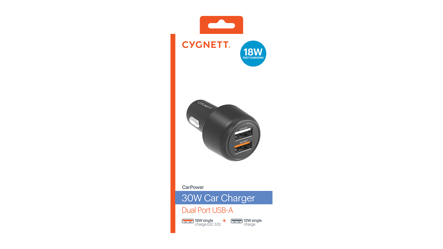 Cygnett 30W Dual Port Car Charger with 12W USB-A + 18W QC 3.0