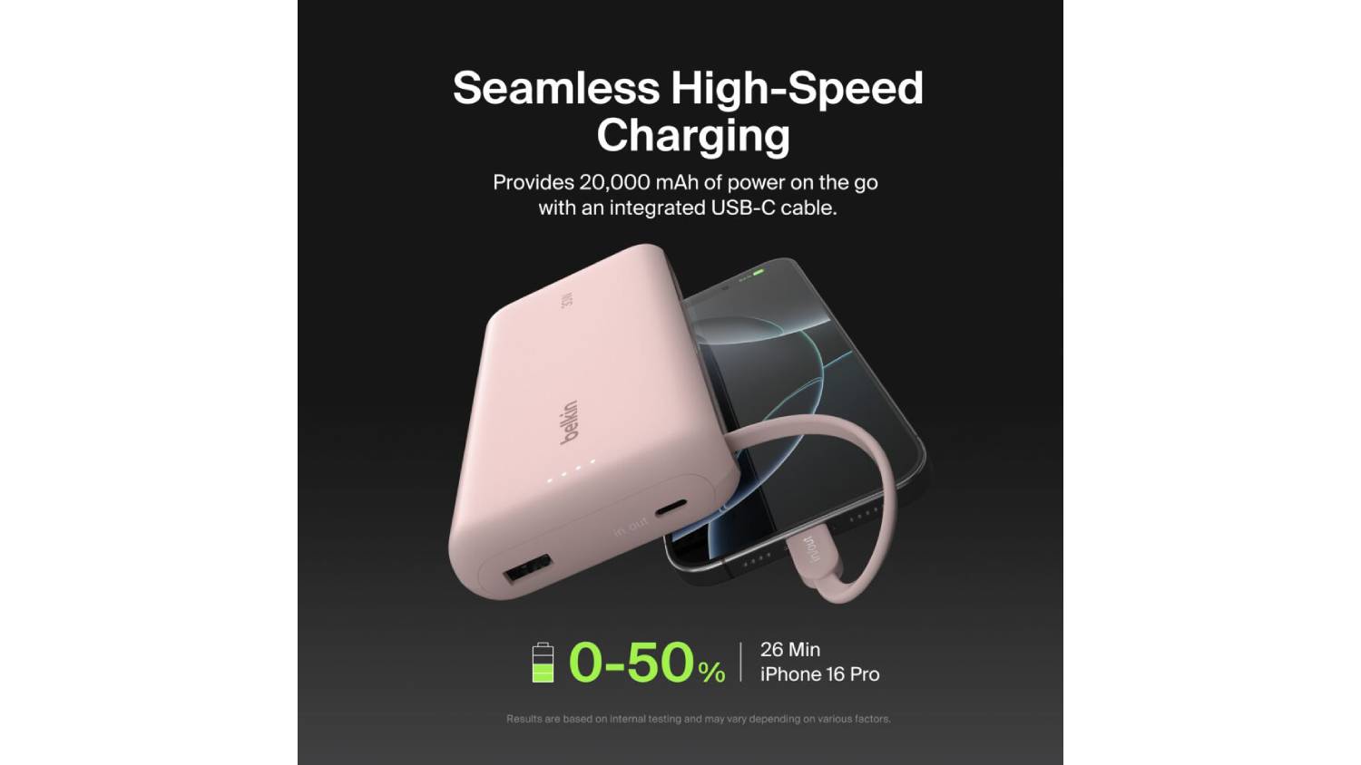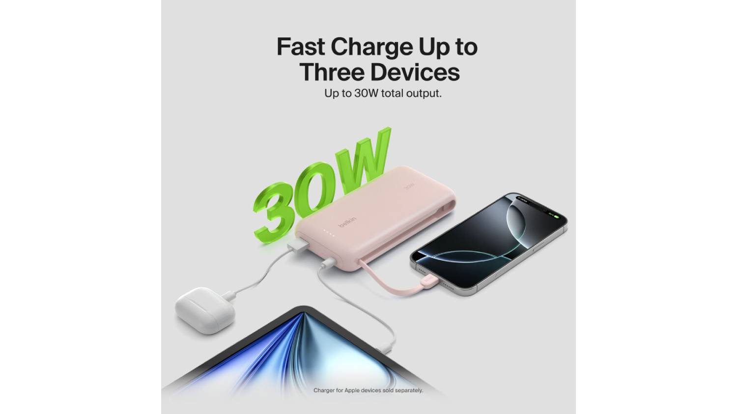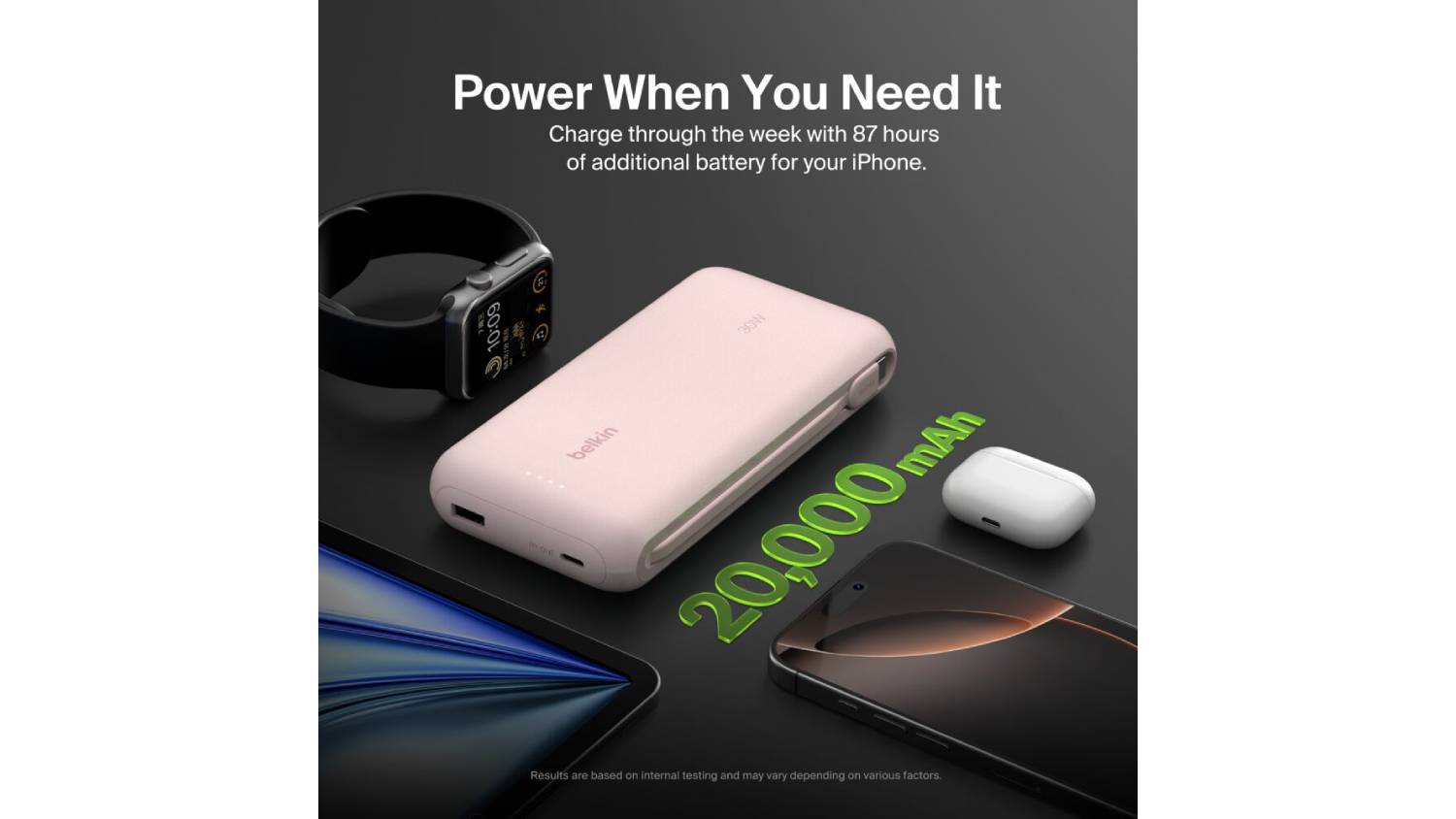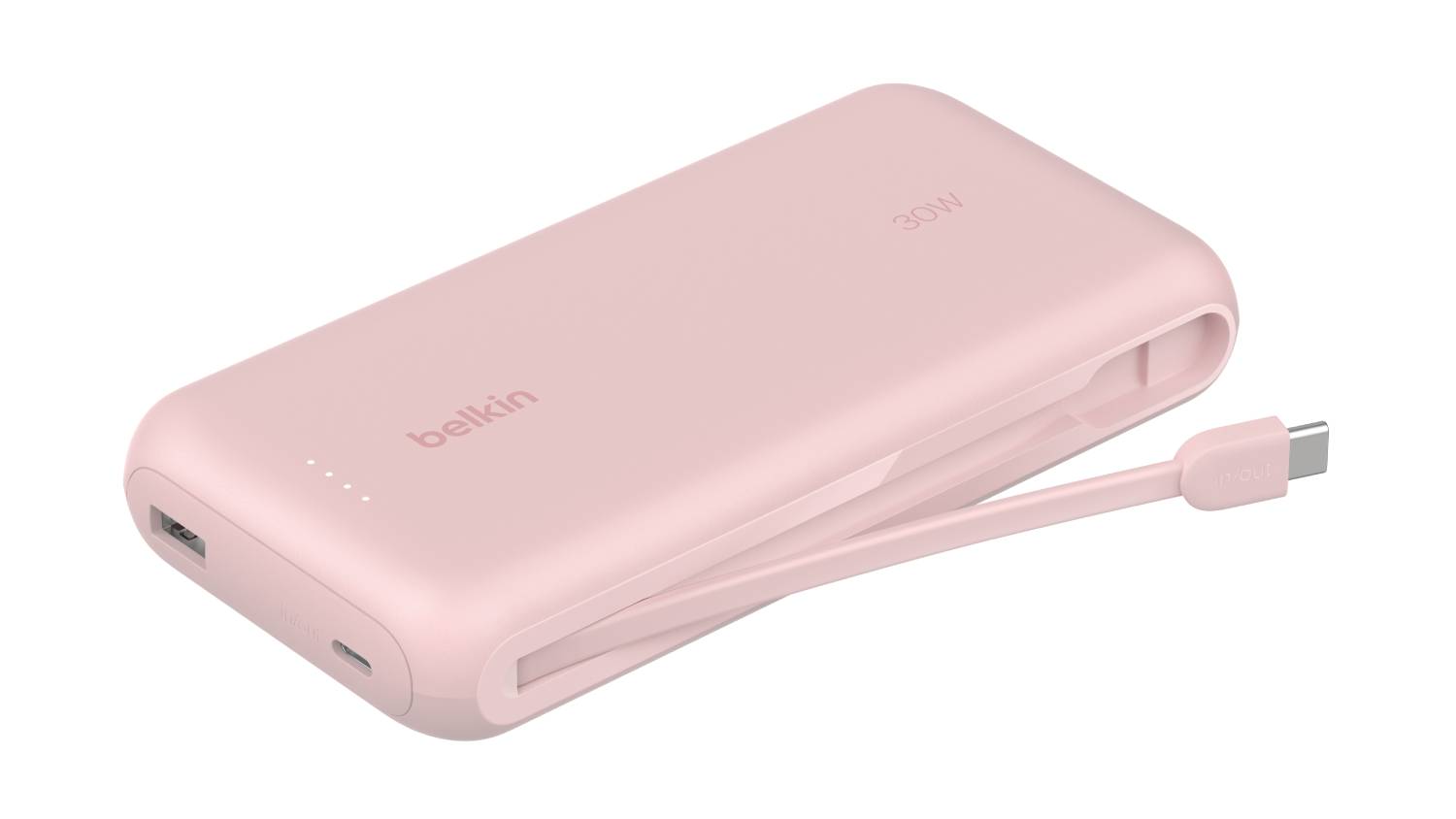 Keep your devices going with the Belkin BoostCharge 20,000mAh Power Bank. This compact fast charger integrates a USB-C cable, plus USB-C and USB-A ports, so you can refuel multiple devices effortlessly. Delivering up to 30W of total output, it's the ideal backup power solution for your travels and everyday journeys!