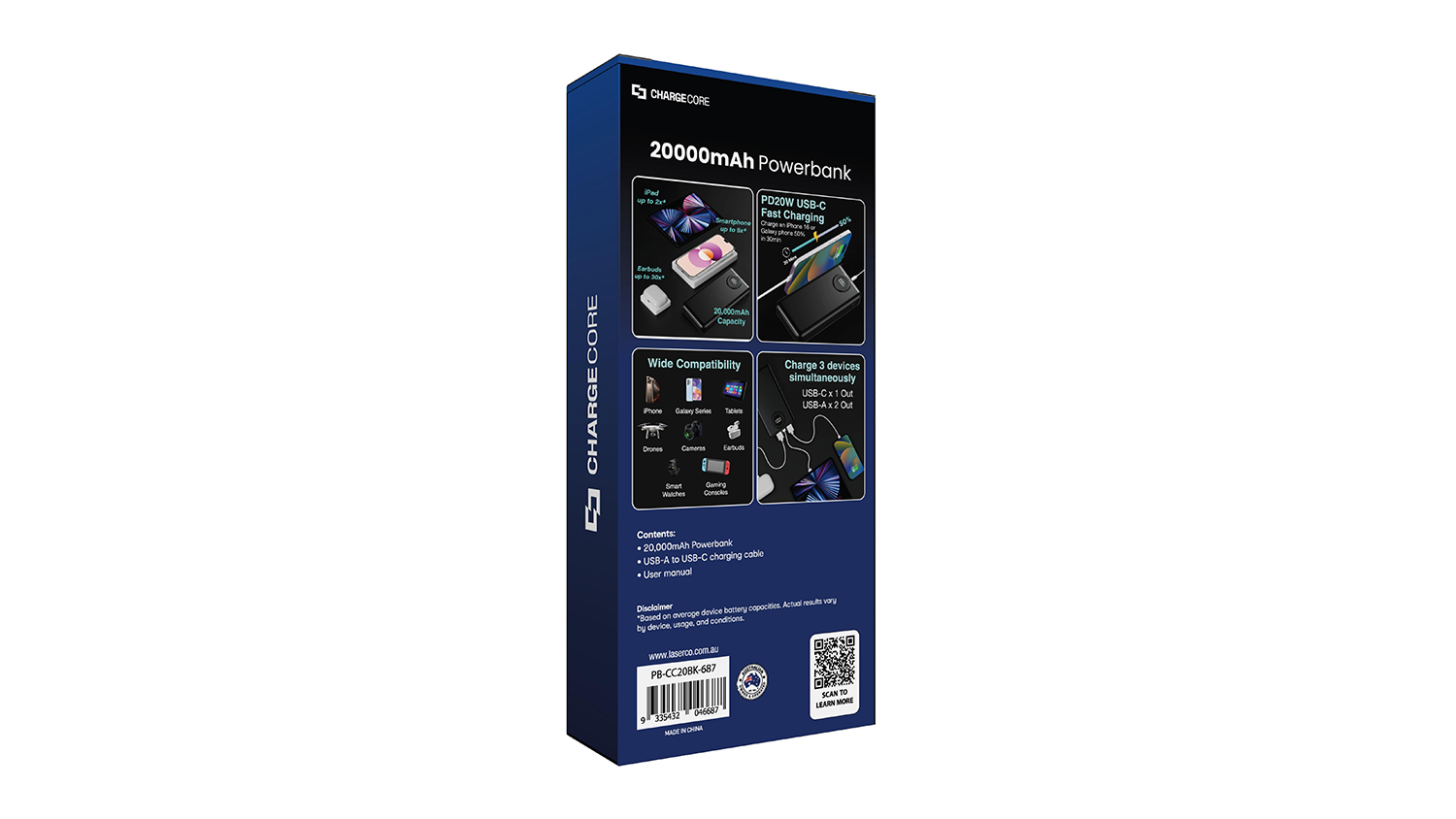 ChargeCore 20,000mAh 3-Port USB-C/USB-A Power Bank - Black (PB-CC20BK-687)