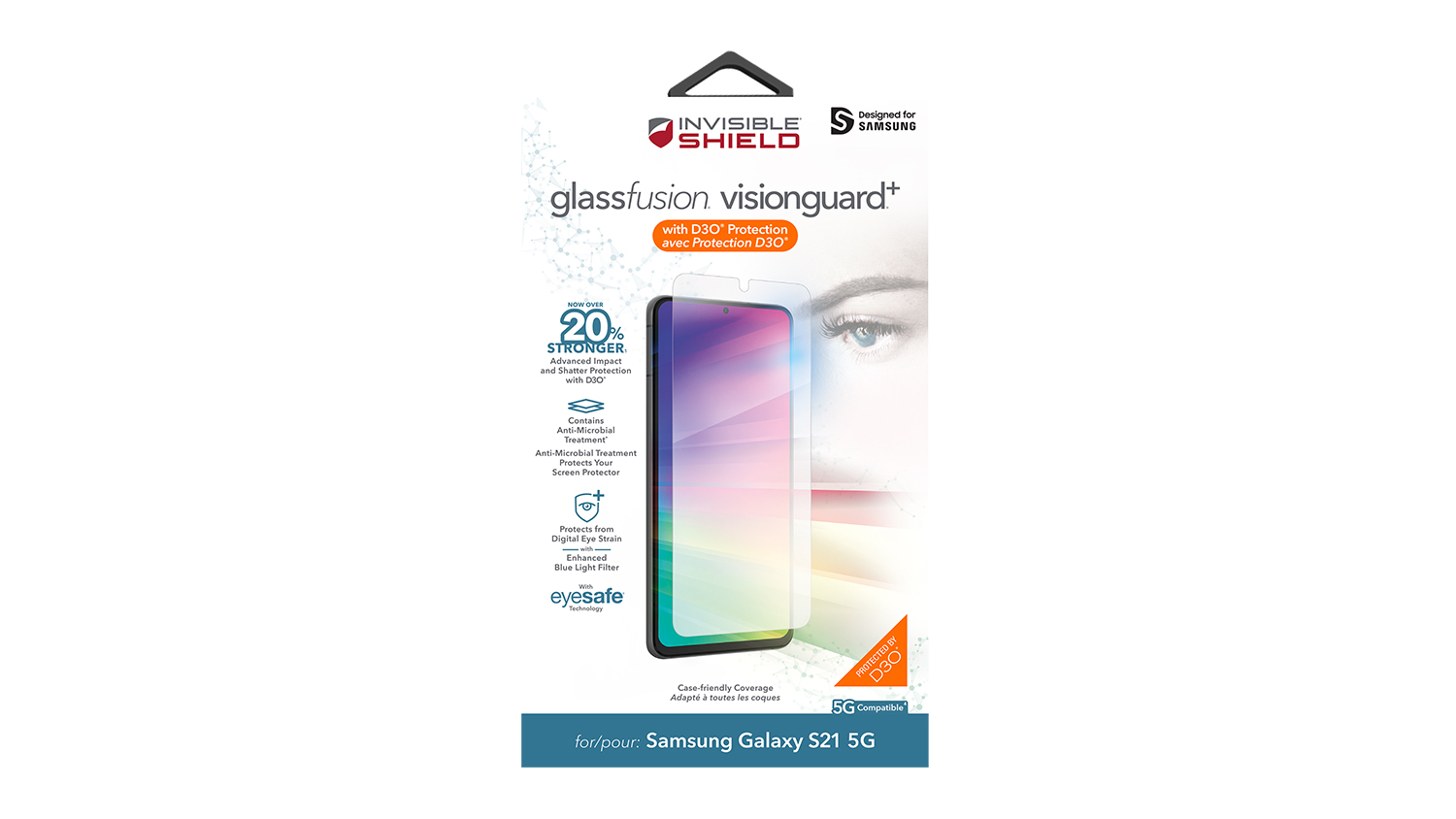 Combining the impact protection of D3O and anti-microbial treatment, this screen protector from Zagg can keep your Samsung Galaxy S21 5G’s screen safe from scratches and bacteria build-up. The ZaggInvisibleShieldGlassFusionVisionGuard+ with D3O also equips an Eyesafe layer that filters harmful blue light which can cause eye fatigue.
