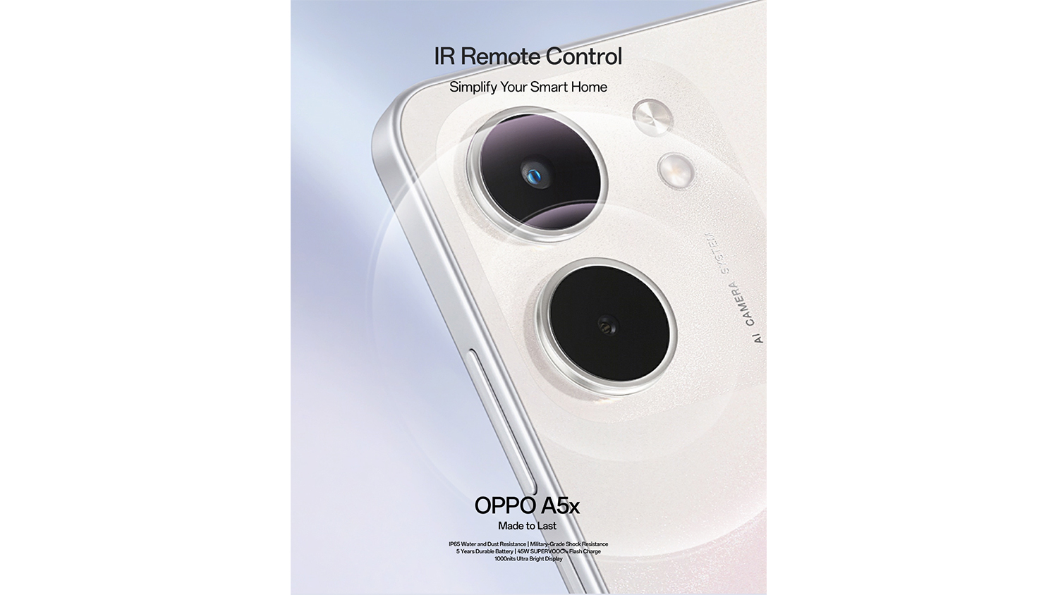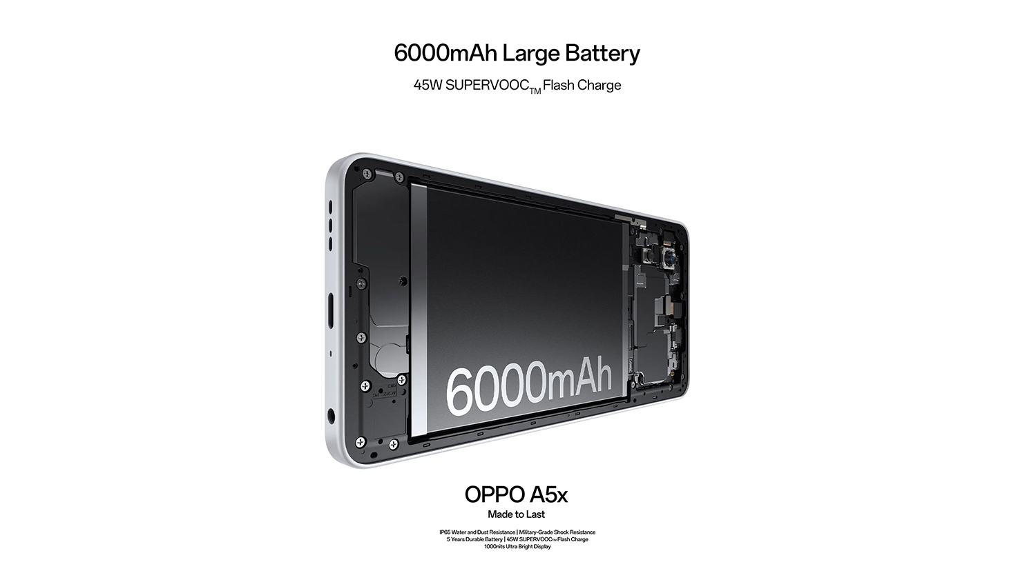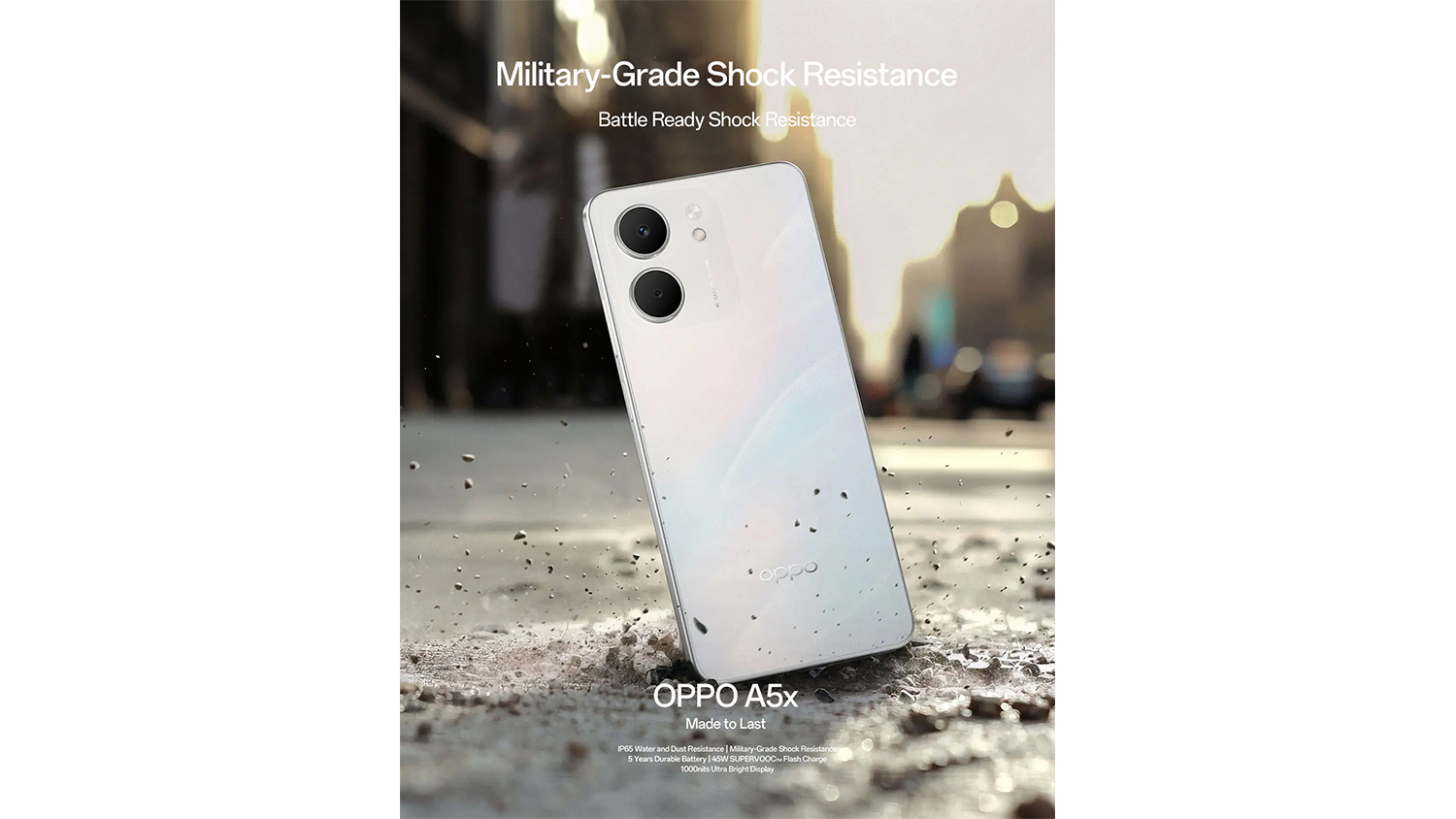 3OPPO A5x has undergone durability testing, including multi-angle drop tests and high-intensity impact tests, based on MIL-STD 810H methodologies and SGS certification. These tests assess shock resistance under controlled conditions but do not guarantee damage-proof performance in real-world scenarios. As durability can be affected by individual usage and product aging, actual user experience may vary.