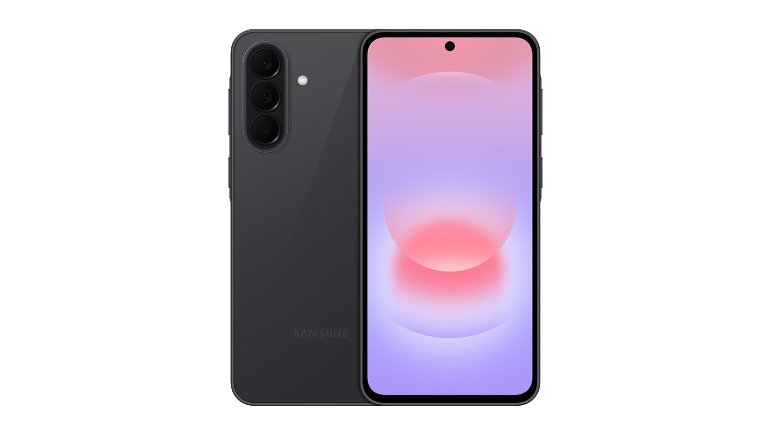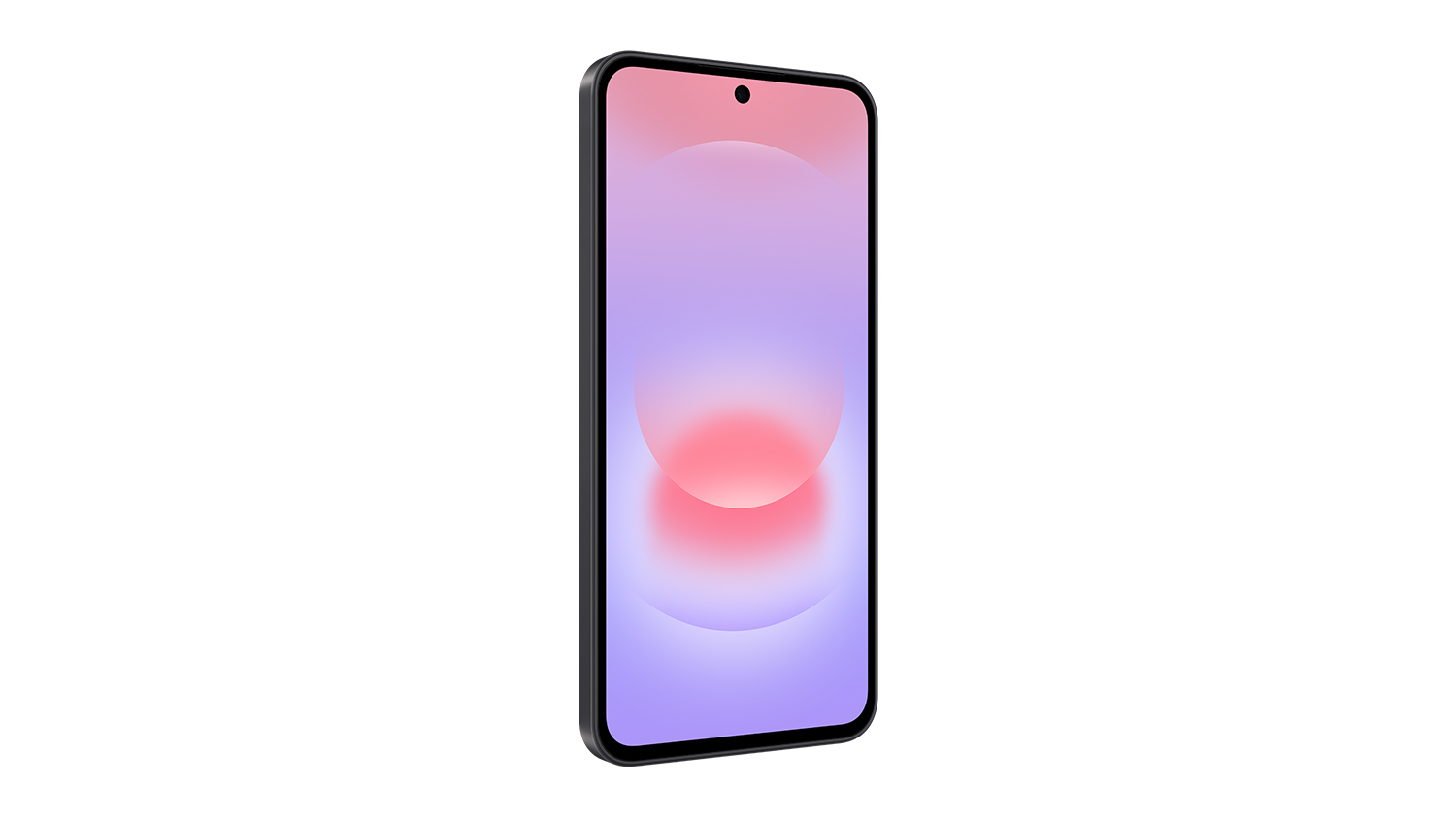 Front-facing view of Samsung Galaxy A37 5G in Awesome Charcoal with a vibrant wallpaper