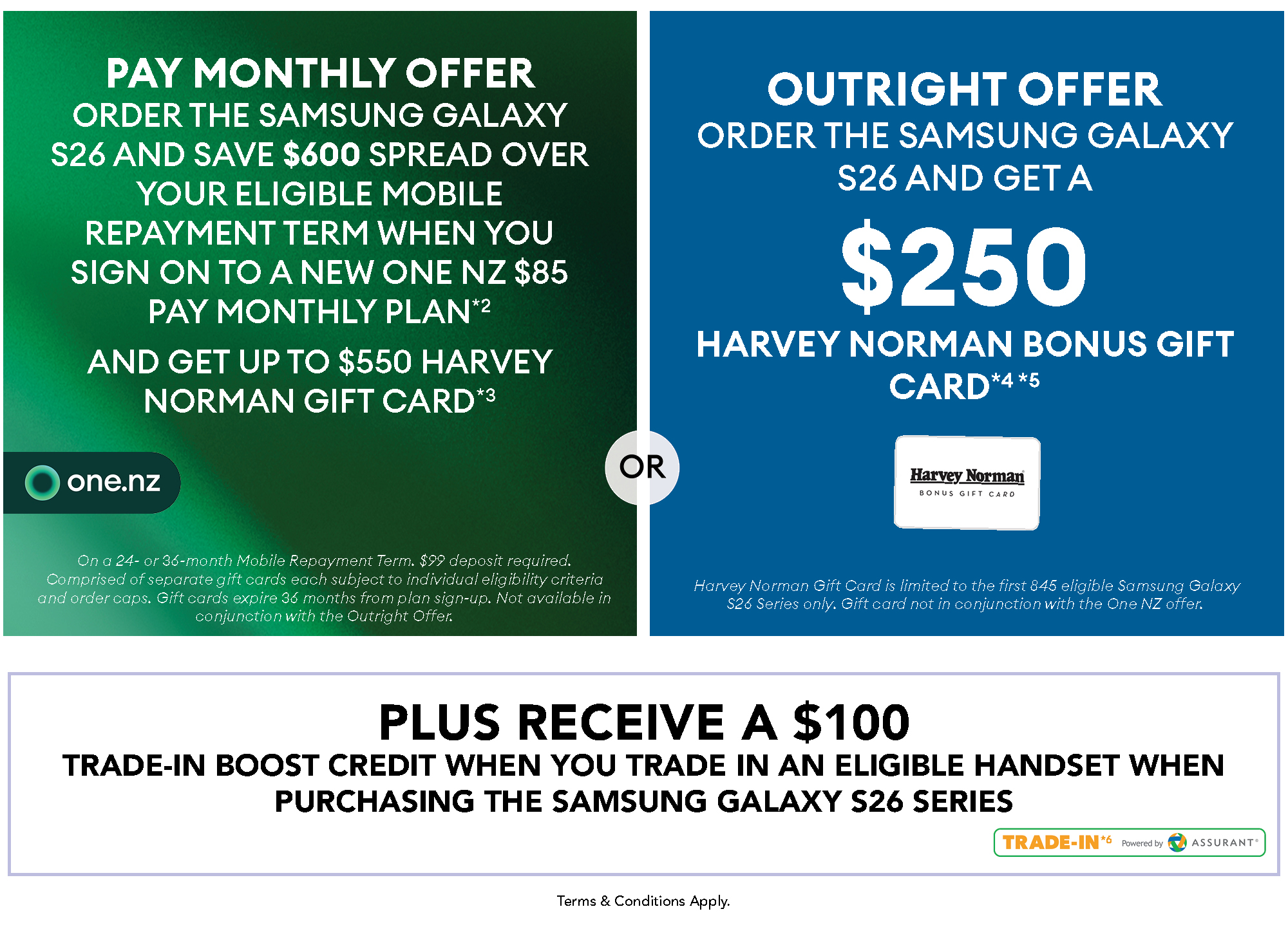 *3. One NZ Pay Monthly Gift Card Offer on the Samsung S26 or 26+: Valued at up to $550 is comprised of: $200 Harvey Norman Gift Card when you sign up to a New One NZ $70 or above Pay Monthly Plan and $100 Harvey Norman Bonus Gift Card when you purchase a Samsung Galaxy S26 Series on a New 24 or 36 month One NZ Mobile Repayment Term on an Eligible Plan (Limited to first 300 eligible orders or before 04/03/2026) and $250 Harvey Norman Bonus Gift Card (Limited to the first 845 Samsung Galaxy S26 Series orders or before 08/04/2026). Both promotions apply to new customers only. Minimum 6 month term required. If you exit, transfer, trade-down or re-sign within 6 months, $200 of the gift card value will be charged to your One NZ bill. Gift cards expire 36 months from plan sign-up. Not offered in conjunction with any other One NZ gift card offers. Bonus gift cards are not redeemable for cash and cannot be used in the transaction in which it is issued. If goods are refunded because you have simply changed your mind, then the gift card must be returned (if unused) or the value of the gift card must be deducted from the refunded amount. Exclusions, eligibility criteria and terms apply. See www.harveynorman.co.nz/gift-card-terms-and-conditions.html or in store for terms and conditions. Terms and conditions apply see one.nz/HNgiftterms.