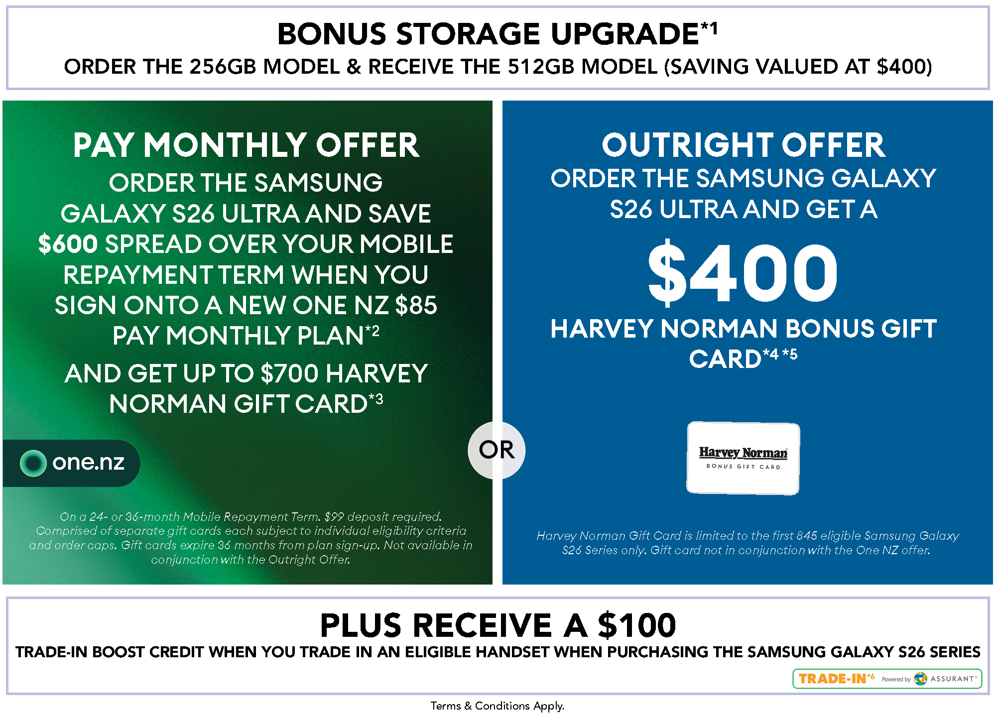 *3. One NZ Pay Monthly Gift Card Offer on the Samsung S26 Ultra: Valued at up to $700 is comprised of: $200 Harvey Norman Gift Card when you sign up to a New One NZ $70 or above Pay Monthly Plan and $100 Harvey Norman Bonus Gift Card when you purchase a Samsung Galaxy S26 Series on a New 24 or 36 month One NZ Mobile Repayment Term on an Eligible Plan (Limited to first 300 eligible orders or before 04/03/2026) and $400 Harvey Norman Bonus Gift Card (Limited to the first 845 Samsung Galaxy S26 Series orders or before 8/04/2026). Both promotions apply to new customers only. Minimum 6 month term required. If you exit, transfer, trade-down or re-sign within 6 months, $200 of the gift card value will be charged to your One NZ bill. Gift cards expire 36 months from plan sign-up. Not offered in conjunction with any other One NZ gift card offers. Bonus gift cards are not redeemable for cash and cannot be used in the transaction in which it is issued. If goods are refunded because you have simply changed your mind, then the gift card must be returned (if unused) or the value of the gift card must be deducted from the refunded amount. Exclusions, eligibility criteria and terms apply. See www.harveynorman.co.nz/gift-card-terms-and-conditions.html or in store for terms and conditions. Terms and conditions apply see one.nz/HNgiftterms.