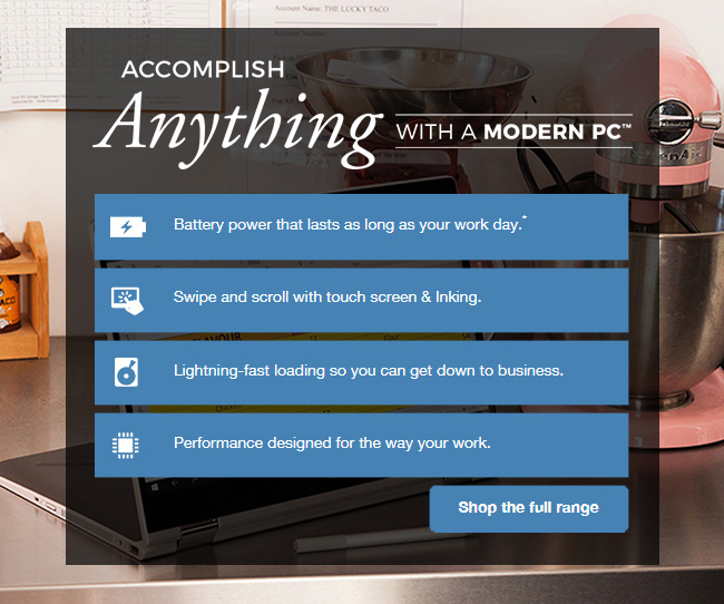Modern PCs are built for life as it actually is, not some imaginary place where they don't have deadlines and our ideas are always perfect. With a Modern PC by your side, you have the flexibility to work when you need to, not when your computer says you can. Its instant start-up with Windows® Hello means getting back into it is as easy as 1-2-3. It's also thinner and lighter, so you can take it with you wherever life takes you. The versatility of its structure means you can use it in four different ways, depending on your needs - from conventional laptop to tablet. As if that's not enough, its all-day battery life means you can just keep working and don't have to go searching around for the charging cable.