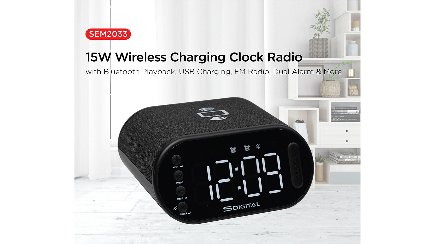 S-Digital Alarm Clock with FM Radio, Dual Charging & Bluetooth - Black (SEM2033)