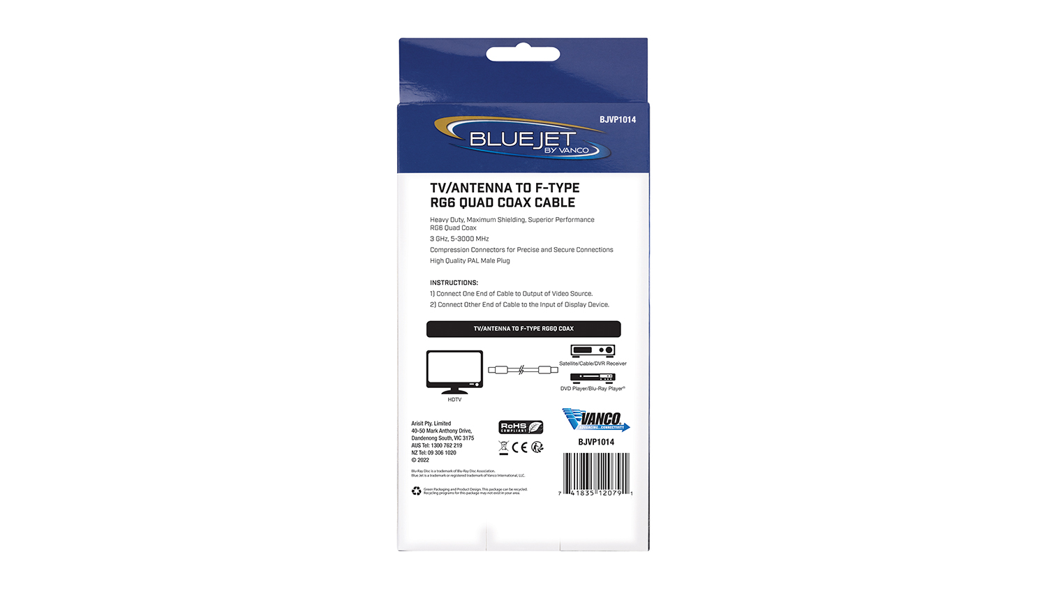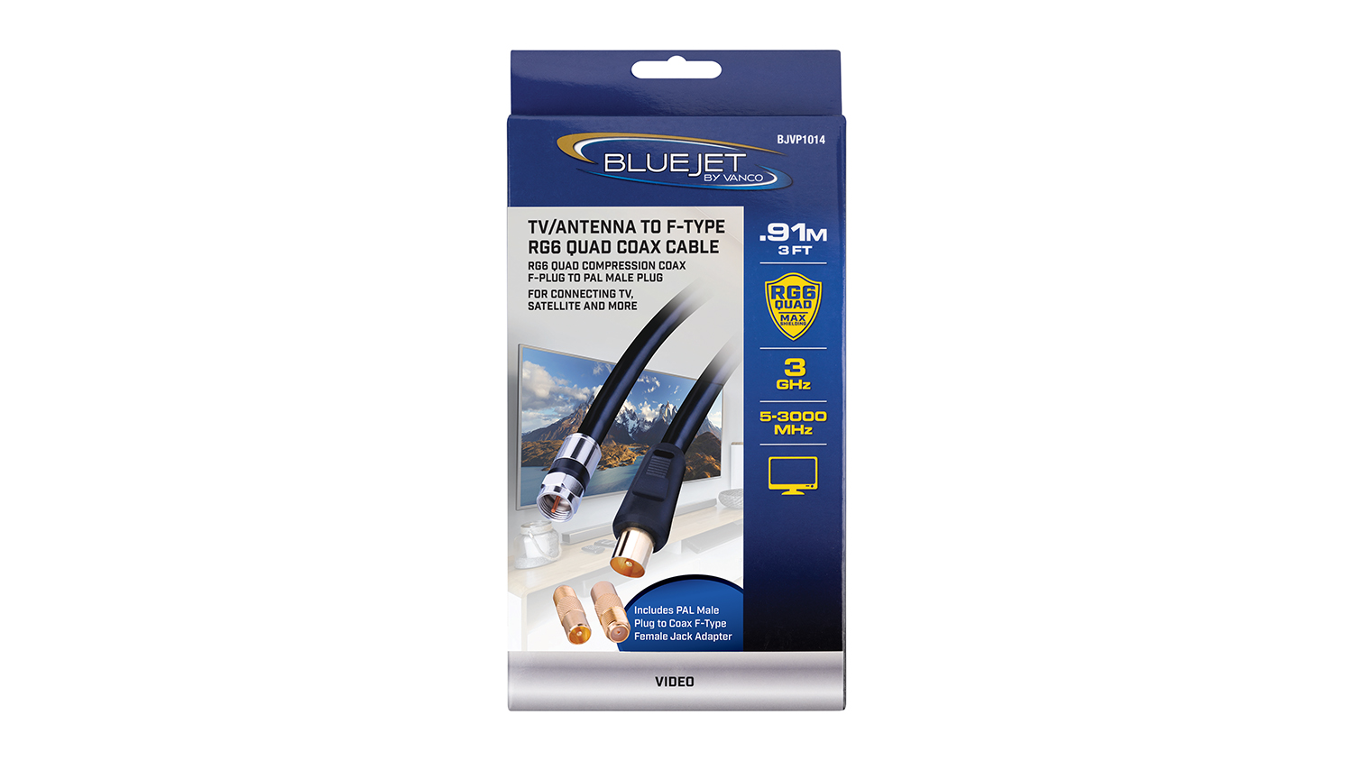 Experience high-quality reception and stable transmission with the help of the Vanco Bluejet 0.91m Video Adapter. Equipped with PAL Male to F-Type connectors, this cable is a great solution for connecting your various compatible entertainment devices. It also supports RG6 Quad Shielding and a wide 5-3000MHz frequency range to ensure reliable performance.