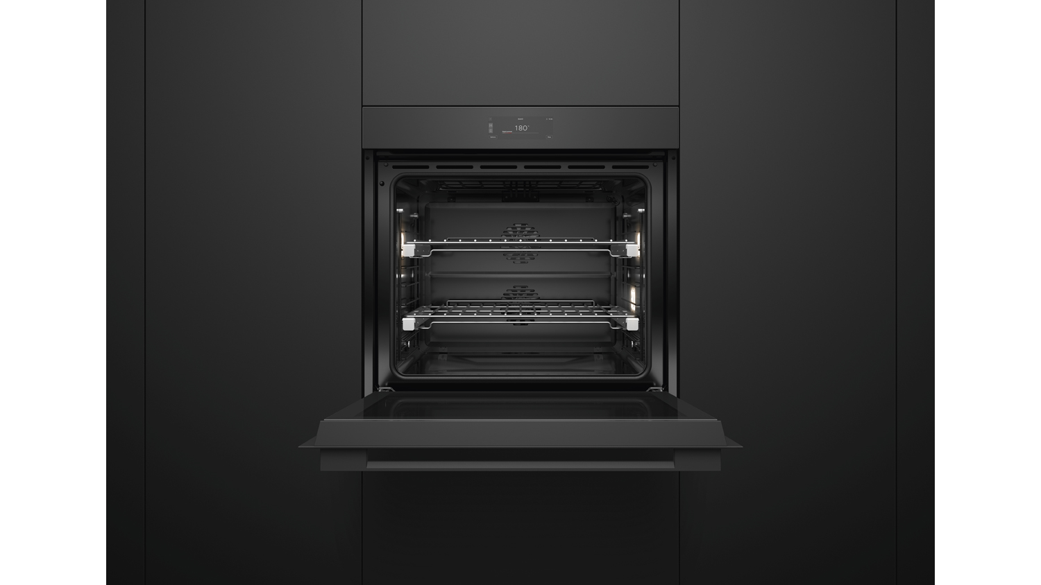 Seamless Integration: With its premium design and sleek black glass finish, the Series 9 Built-In Oven beautifully integrates into your cabinetry. It also has full extension sliding shelves for safe loading and unloading of dishes.