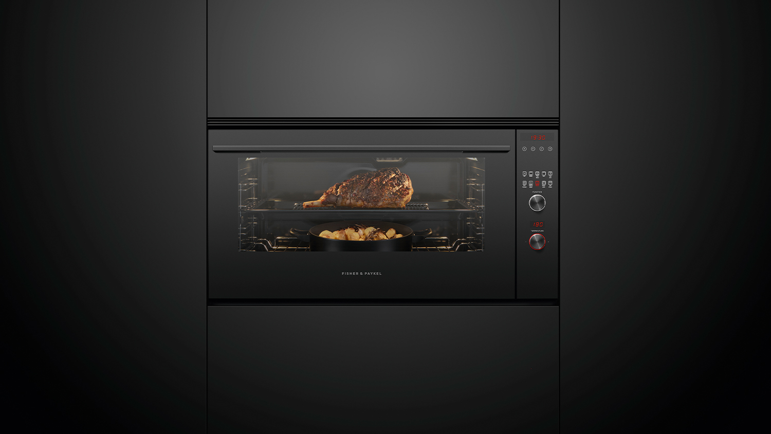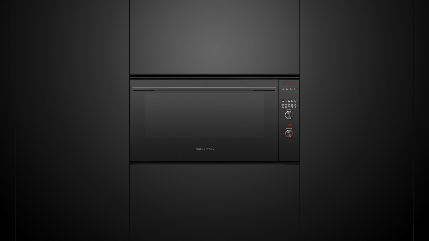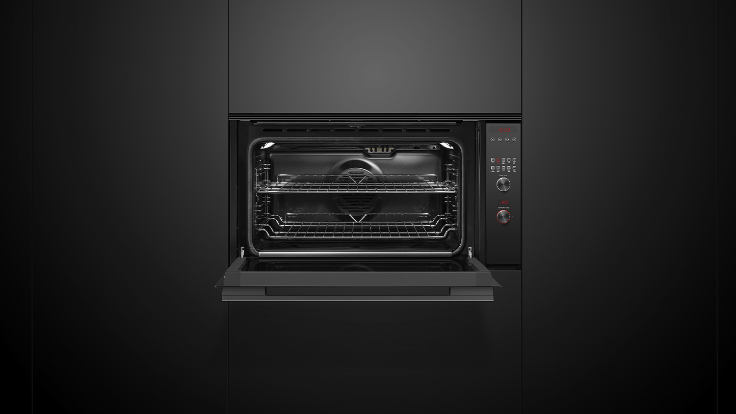 Streamlined Build: Designed for built-in installation, this Fisher & Paykel Oven showcases a sleek black finish and a pull-down door with a towel bar handle that can surely complement your existing cabinetry.