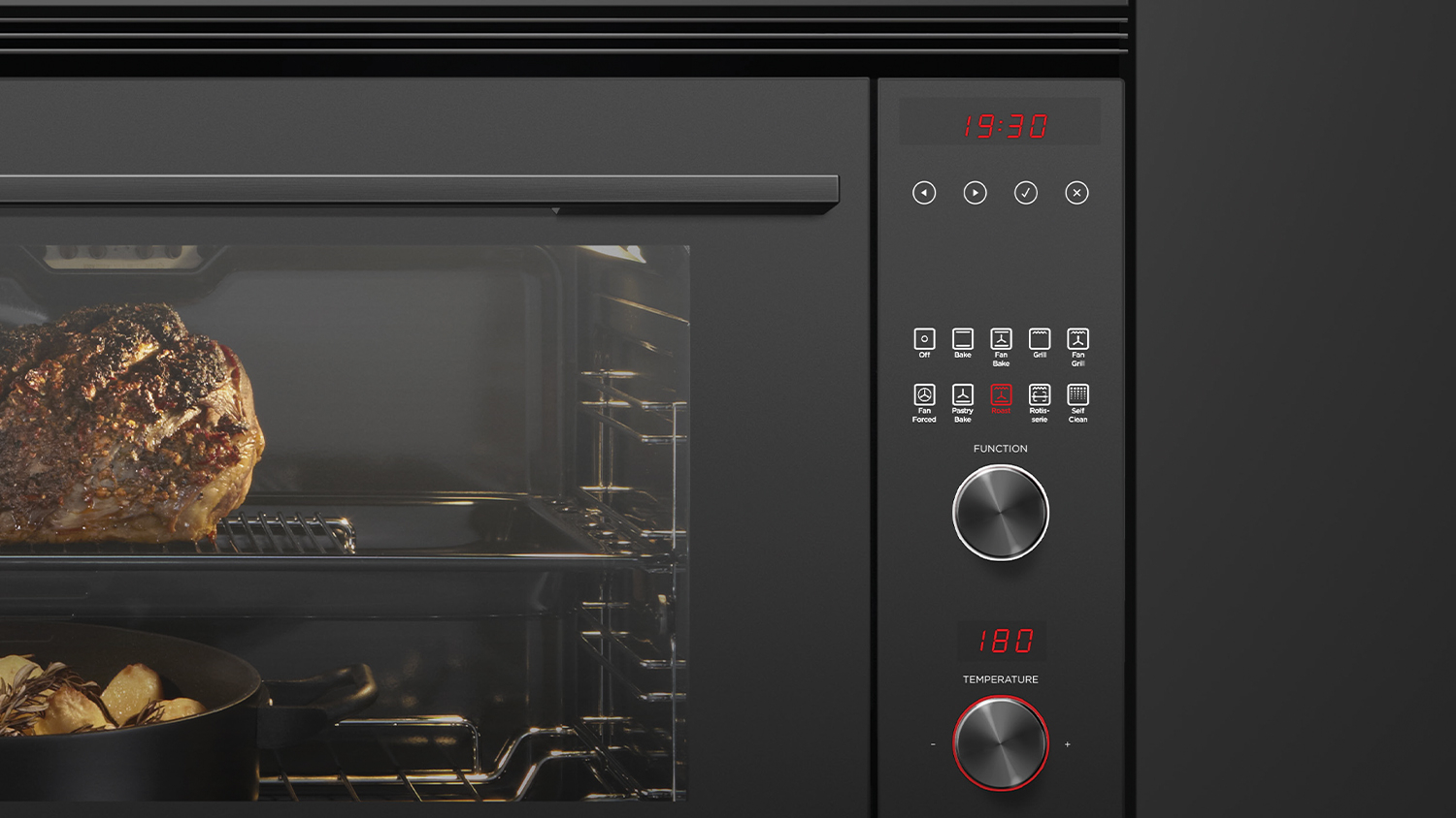Level up your kitchen and streamline your cooking routine with the Fisher & Paykel 90cm 9 Function Built In Oven! A fantastic kitchen companion, this appliance boasts AeroTech™, letting you take advantage of functions such as Bake, Fan Bake, Fan Forced, Fan Grill, Grill, Pastry Bake, Roast, and Rotisserie to create unlimited delectable dishes. It also integrates a convenient Pyrolytic Self-Cleaning function, so you can tidy it up with minimal effort. Plus, this unit flaunts a sleek black finish and a premium tower bar handle to complement most modern interiors.