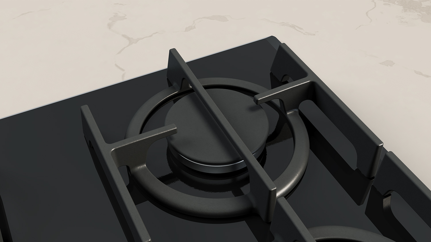 | Cooktop Surface Material | Black Glass, Cast Iron Pan Supports |