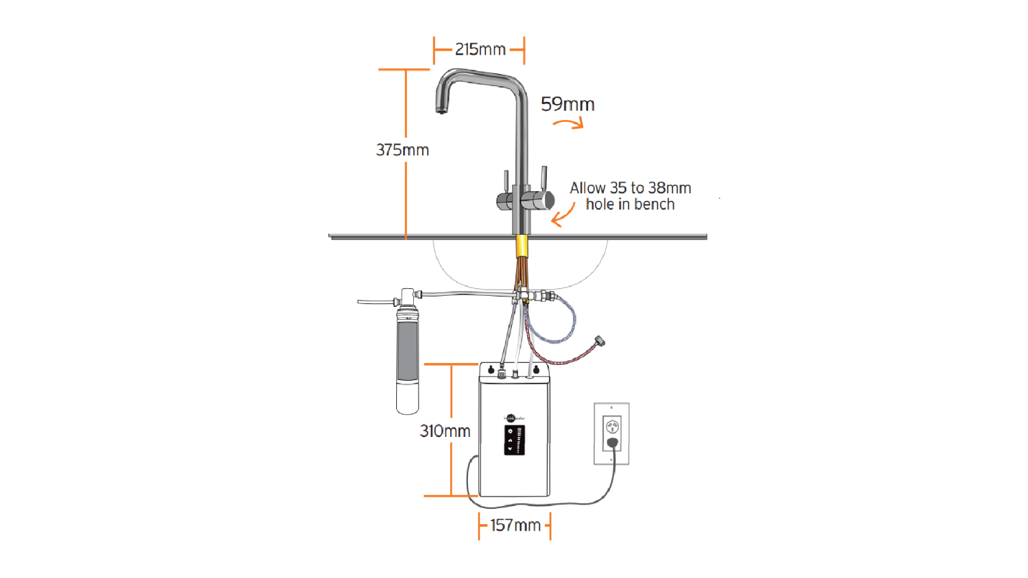 Quench your thirst on demand with the InSinkerator Near-Boiling & Cold Filtered Mixed Multi Tap! This intelligent system offers instant access to chilled and hot filtered water with just a simple press of a button. It also equips multiple advanced features like easy-grip handles, a safety lever, a DZR Brass material, and WELS and WaterMakrk certification for added user convenience. Plus, it is easy to install and offers a space-saving design for effortless integration into any kitchen sink.