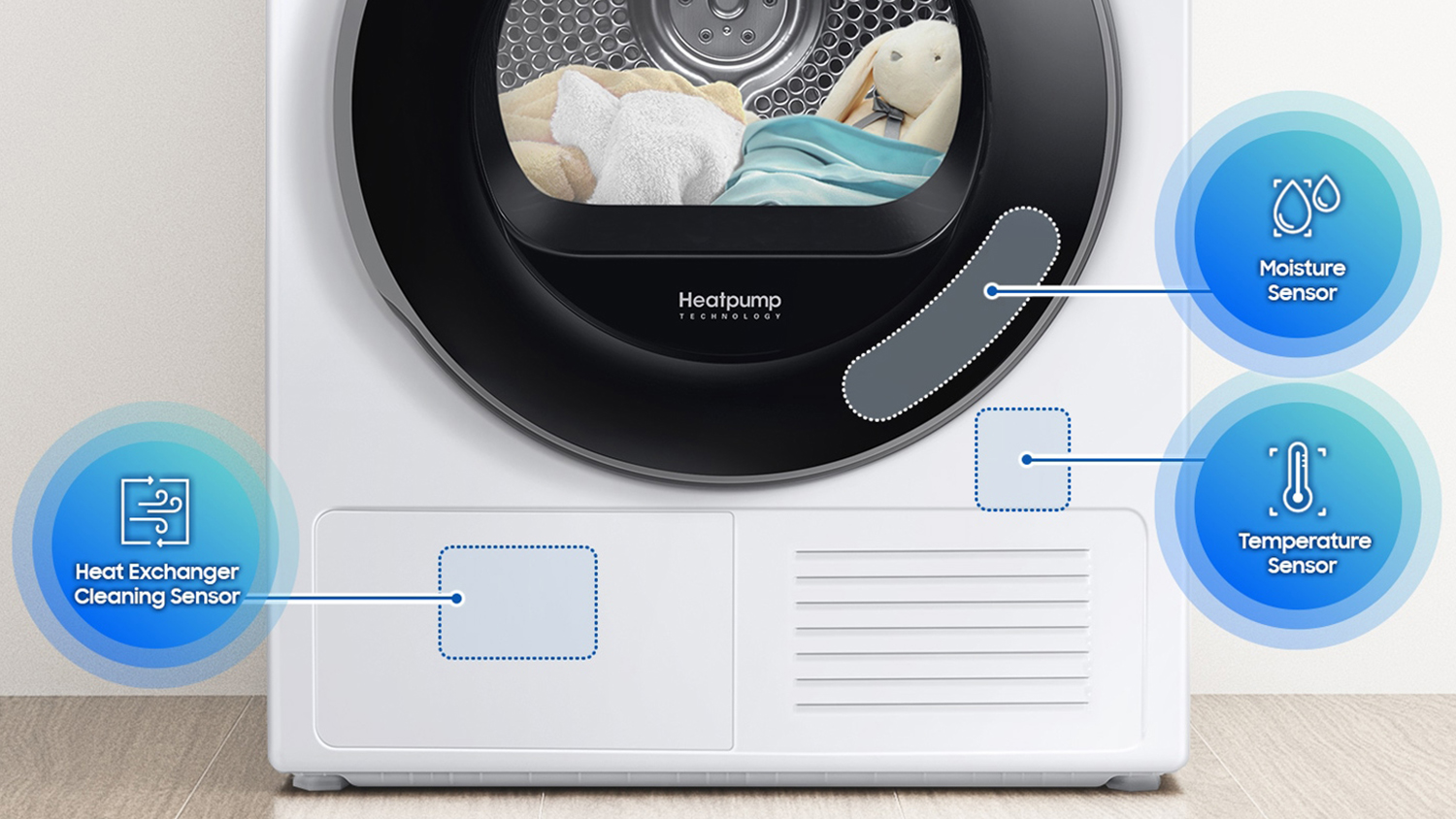 - Feature Packed: Achieve perfectly dried clothes with AI Dry, which adjusts the process based on humidity and temperature for energy-efficient results. The Quick Dry cycle handles 1kg of laundry in just 35 minutes*, while the Wrinkle Prevent function smooths out creases. It also has an Air Wash that deodorises and sanitises clothes** with hot air, and the Hygiene Care eliminates up to 99% of common bacteria using high heat***.