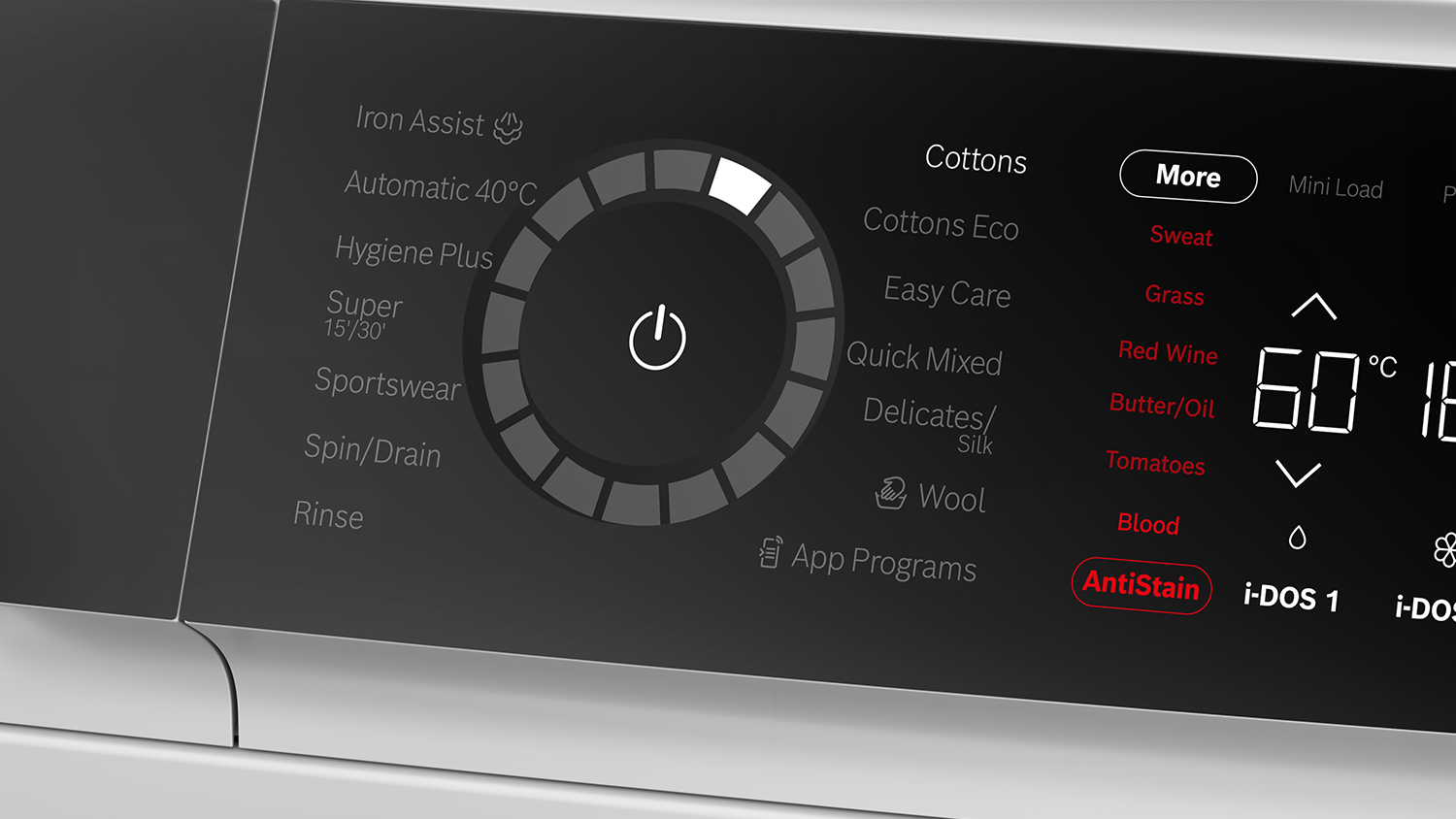 | Wash Programs | Cottons, Cottons Eco, Easy Care, Delicate/Silk, Wool, Automatic, Iron Assist, Hygiene Plus, Spin/Drain, Mixed, Sportswear, Super 15'/30', Rinse |
